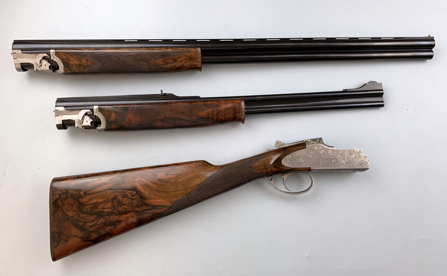 Belle valise CHAPUIS contenant un express superposé à contre platine et à éjecteurs calibre 8/57 JRS et une paire de canons supplémentaires en calibre 20/70. Chaque paire de canons possède son propre devant, longueur des canons express : 550 mm, cale de réglage des tubes proéminente, hausse fluo réglable, attente de montage de lunette usinée dans la bande, les canons lisses mesurent 710 mm de long, alésage et bronzage d’origine, bascule monodétente, trempe grise à contre platine gravée de volutes florales et d’envol de gibier (bécasses sur une face, faisans sur l’autre), un chien tenant en sa gueule une bécasse orne le dessous de la bascule, au dessous du marquage « SUPER ORION », pontet à longue queue et bord ourlé, monture en noyer choisi tout bois forme anglaise de 395 mm de long, bonne réserve de verrouillage, pas de jeux, mécanisme fonctionnel.