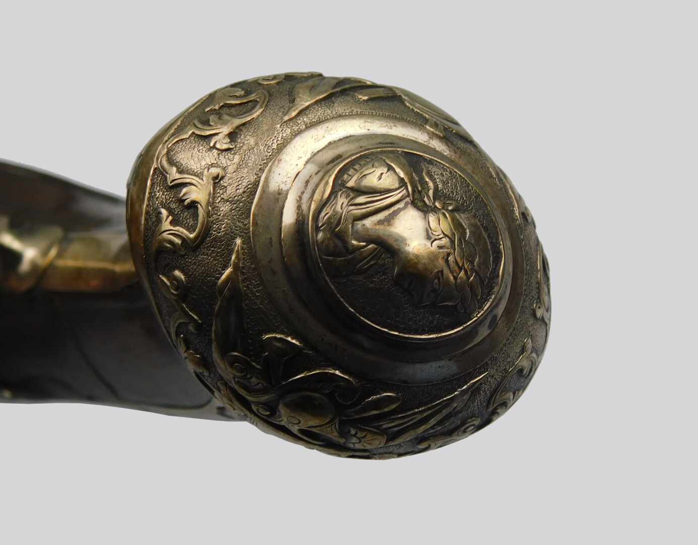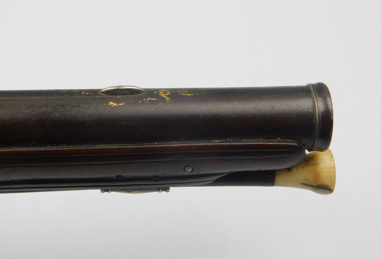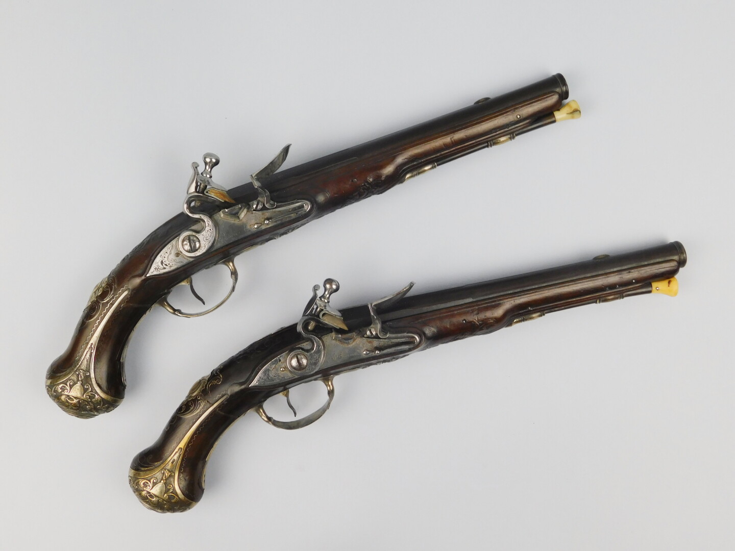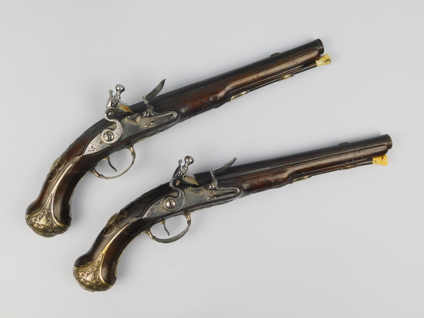 Superbe paire de pistolets à silex mi XVIII°, fabrication LAMOTTE AINE (1715-1796, armurier à partir de 1742, maître armurier en 1770) à Saint Etienne. Arme montée argent (poinçon de maître, charge et décharge), calotte à longues oreilles, clou de calotte à profil à l’Antique. Pièce de pouce en relief, contre platine découpée. La mise en bois de toutes les garnitures est surlignée d’une sculpture en relief afin de les rehausser, une larme termine la mise en bois à l’arrière du corps de platine. Un bouquet floral surligne de belle manière l’encastrement de la queue de bascule dans la monture. Une incrustation de fil d’argent augmente encore, de manière certaine, la décoration de la monture. La mise en bois se prolonge jusqu’à la bouche du canon. Fracture au col recollée sur les deux pistolets. Corps de patine plat, chien col de cygne plat, bassinet fer à pans, ressort de batterie vissé de l’intérieur, canons octogonaux au demi puis ronds, bande plate portant un guidon en demi-lune en argent. Légère incrustation dorée, bouche renforcée, tube en calibre 14 mm retenant encore la majeure partie de leur finition bleu d’eau. Platine et queue de culasse poli blanc, baguette fanon de baleine et morfil avec son tire bourre sur l’une et son passant à chiffon sur l’autre. Arme dans un état de fraicheur remarquable, si ce n’était la discrète fracture des cols de crosse. Mécanisme fonctionnel.