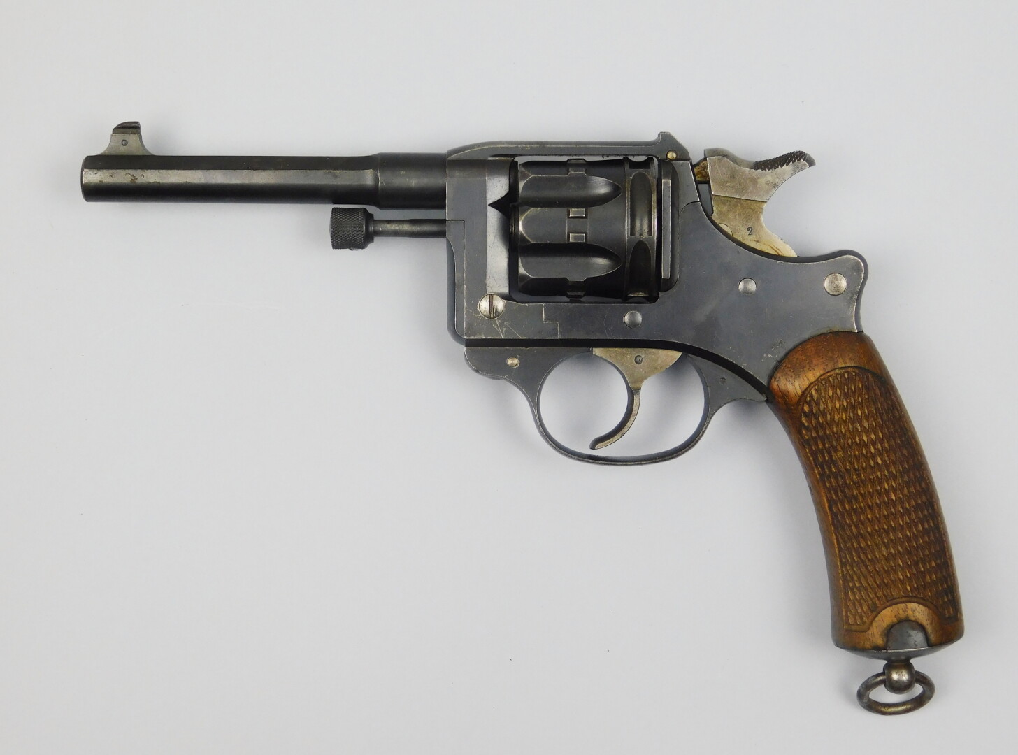 Révolver règlementaire français modèle 1892 d’ordonnance, calibre 8 mm, série 1902 n°G92789 (BI418). Arme dans son bronzage d’origine, pièces annexes retenant encore une grande partie de leur jaune paille, belles plaquettes en noyer quadrillé, canon miroir. Mécanisme fonctionnel.