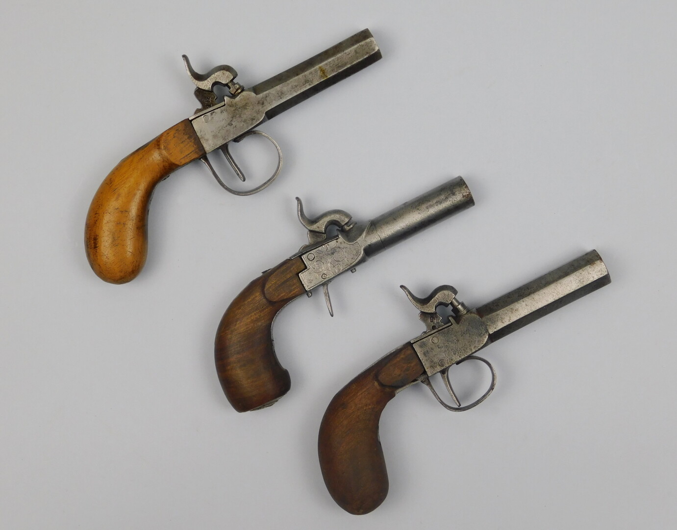 Paire (légèrement désassortie) de pistolets de défense à coffre et à percussion, canons octogonaux, pontets, crosses rondes en noyer. Mécanisme fonctionnel.