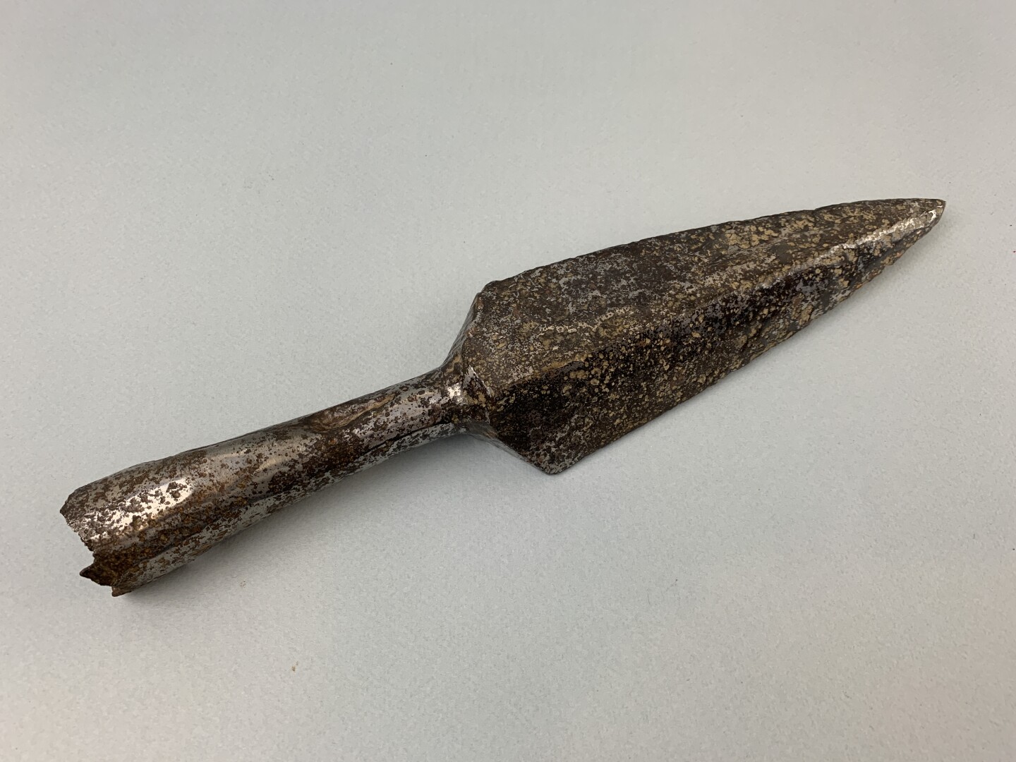 Forte pointe montée sur une douille à quatre pans symétriques de 335 mm de long et de 45 mm d’épaisseur, pointe forgée ancienne, probablement un carreau de baliste.