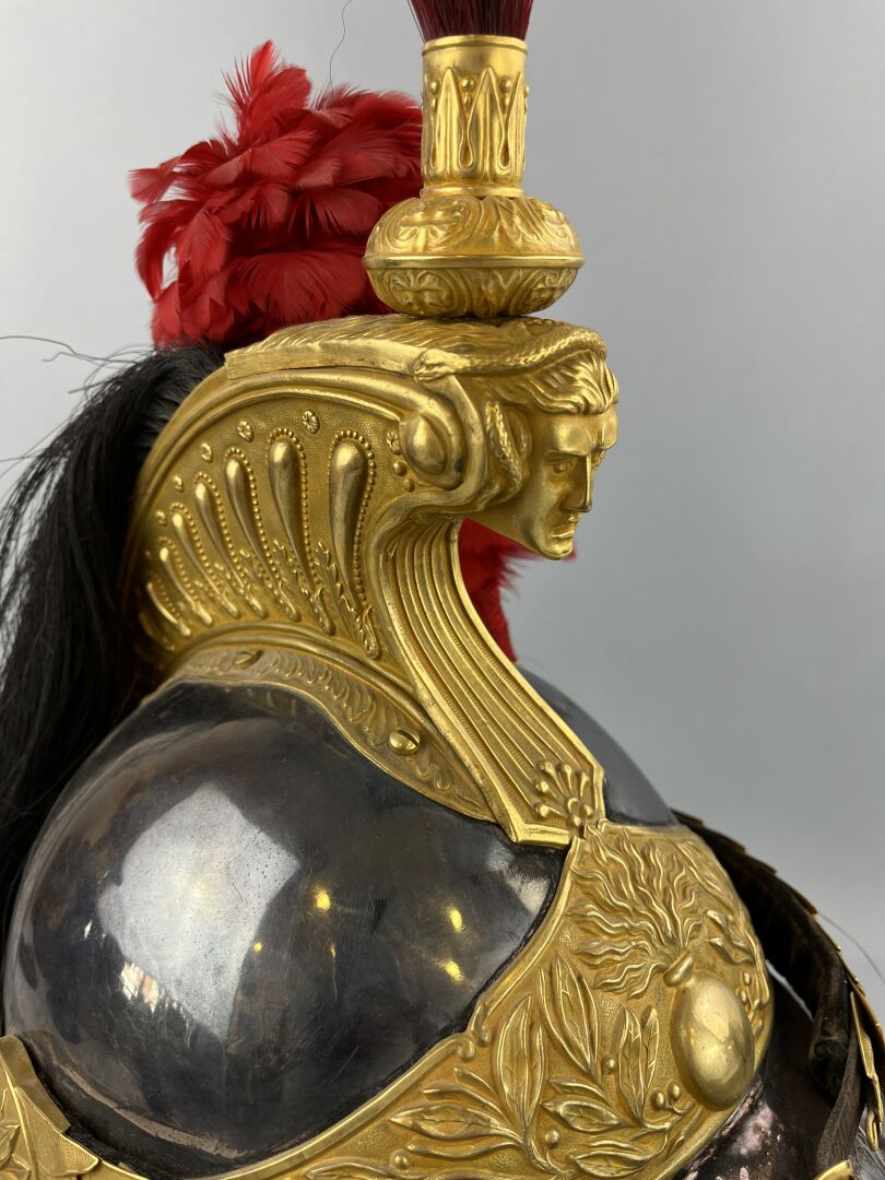 Casque français d’Officier de Cuirassier modèle 1874, bombe plaquée argent, toutes garnitures en feuilles de laiton embossées et dorées, jugulaires à écailles plates sur canapé cuir. Cimier à flanc godronné, marmouset vissé avec toupet en crin lie de vin. Porte plumet avec plumet en plumes de coq rouges, crinière longue avec sa tresse, intérieur dents de loup cuir avec dorure