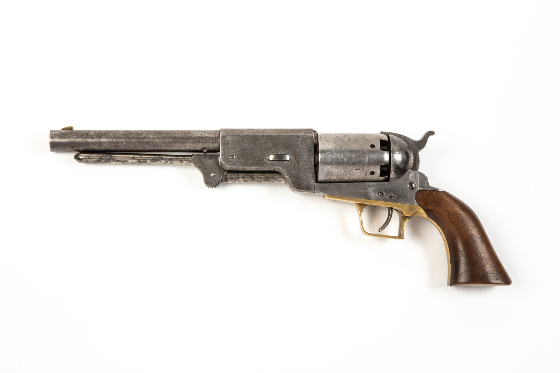 Ancienne réplique d’un révolver Colt Walker calibre 44, scène de bataille sur la barillet se dernier portant des encoches de verrouillage rondes, canon de 230 mm de long, rayures presque droites (8), marqué sur le plat du canon, sur une ligne en lettres bâton « Address Saml Colt New-Yorck City », arme numéro 153 (numéro que l’on retrouve à plusieurs endroits y compris décomposé sur les remparts séparant les cheminées), marquage US 1847 au-dessus de la vis de clavette, (clavette remplacée), l’arme a perdu toute sa finition d’origine, sous-garde en bronze, crochet du ressort principal visible sur la face avant de la bride de crosse en bronze, crosse monobloc en noyer lisse, visserie en pas métrique. Mécanisme fonctionnel.