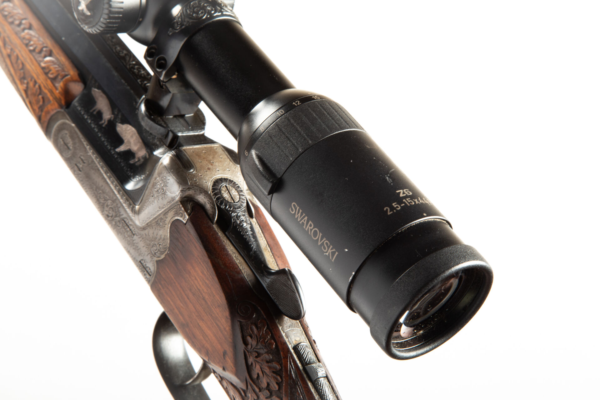 Belle carabine basculante Kipplauf, fabrication Frantz Sodia Ferlach en calibre 7×65 R, canon octogonal puis rond, bande de batture proéminente, double verrouillage Kersten, gravure en incrustation d’argent sur les flancs du tonnerre de sangliers à gauche et de cervidés à droite, bascule entaillage forgeron trempe grise avec gravure de volutes de feuillages et pointes d’épine, double détente, sureté sur queue de bascule, belle monture en noyer vernis, crosse pistolet à joue drapée à gauche et dos de cochon, fine quadrille grain de poudre à la poignée, sculpture de feuilles de chêne au niveau de la plaque de couche et à la poignée, devant démontable par auget Galand également enrichi d’une quadrillé et d’une sarabande de feuilles de chêne sur les tranches de la tuile. Cette arme porte un montage à crochet soutenant une lunette Swarovski 2.5 – 15 x 44P ZG. Les colliers de la lunette sont gravés de volutes de feuillages.
