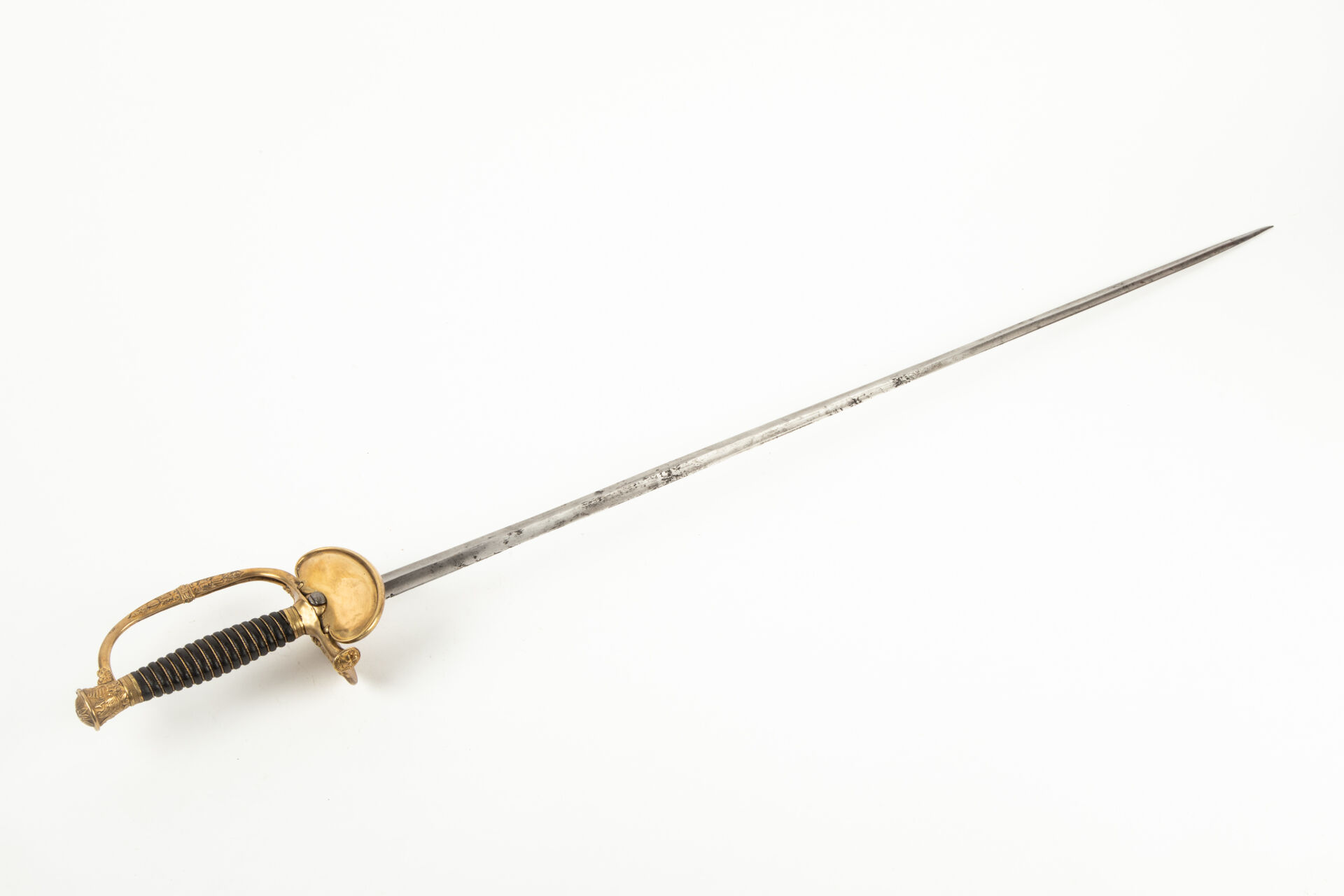 Epée d’Officier d’Infanterie époque Restauration, lame droite symétrique à quatre pans concave et arrête centrale, signature de la Manufacture Royale de Klingenthal mars 182 ?, quelques infimes piqures, monture en bronze doré, pommeau symétrique bombé en son sommet et gravé d’une fleur d’héliotrope, le centre de la fleur constitué par le bouton de rivure de la lame, branche de garde unique baguée en son centre, plateau secondaire lisse rabattable à billes, plateau principal aux grandes armes de France sur écu couronné entouré de deux branches de laurier sur fond de tombée de drapeaux, quillon droit ovale au mufle léonin, fusée cuir sombre filigranée postérieure ?. Pas de fourreau