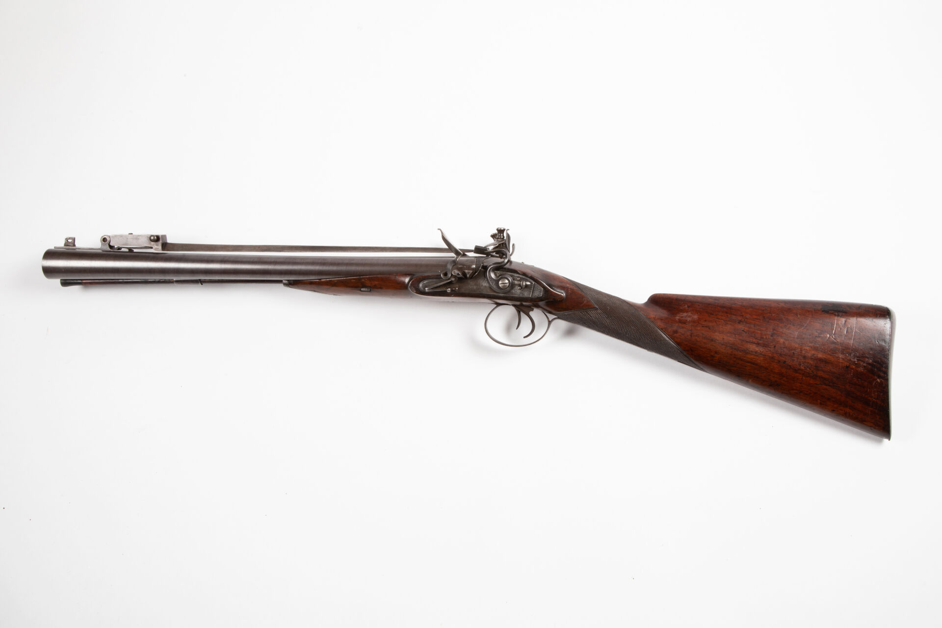 Fort et intéressant tromblon double à silex par JOHNES London comme en atteste la signature et sur la bande des canons et sur les corps de platine. Deux forts canons calibre 12 balles à la livre légèrement tromblonnés à la bouche en damas couleur tabac de 460 mm. Une forte baïonnette lancée est articulée sur la bande, propulsée par un ressort et retenue par un verrou au niveau de la queue de culasse, lame triangulaire à trois pans dont un creux. Platine à silex à corps plat, chien col de cygne plat, sureté bloquant l’abattue du chien, bassinet fer waterproof, ressort de batterie à galet, arme montée fer, pontet rond, capuche à décor d’ananas tout comme le prolongement avant du pontet. Baguette bois à embout corne, plaque de couche à long retour. Mécanisme fonctionnel.