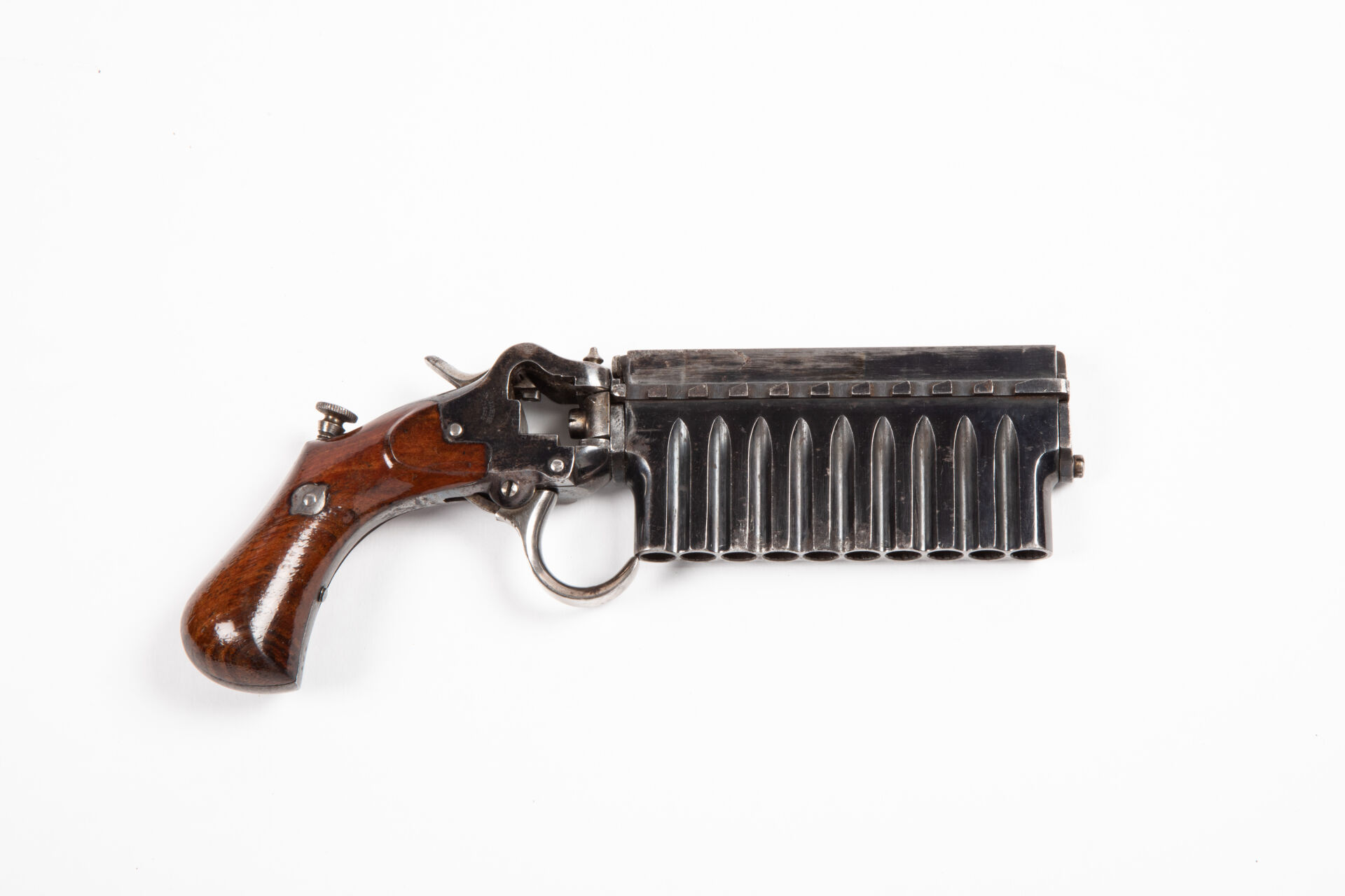 Joli petit coffret contenant un pistolet harmonica jarre à 10 coups, ce pistolet, avec son chargeur pausé à plat dans l’axe est monté à la française sur un lit de velours violet, le coffret contient un tournevis, une baguette, un huilier, le couvercle porte en lettres dorées la signature « A. JARRE BREVETE PARIS 28 BOULEVARD POISSONIERE », le velours de la face interne du couvercle est plus insolé que le reste du velours, le pistolet retient encore l’intégralité de son bronzage d’origine, l’harmonica est un harmonica d’origine et non pas une reproduction, le pistolet est monté avec deux plaquettes en noyer lisse vernis, la baguette érectrice est fixée verticalement dans la poignée, le mécanisme est fonctionnel.