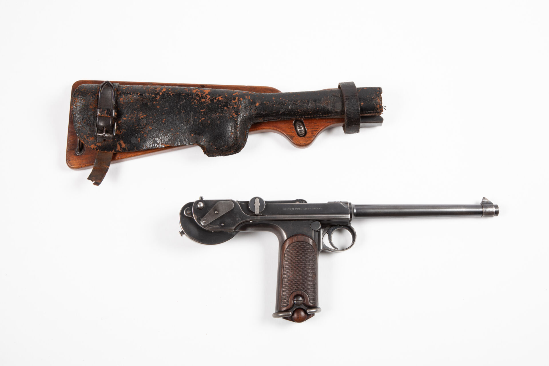 Pistolet semi-automatique Borchardt C-93, calibre 7,65. Arme n°429, le numéro se retrouve à l’arrière du puits de chargeur, sur le flanc gauche de la détente, sur la mortaise en T de fixation de l’étui-crosse et sur le flanc arrière de la genouillère. Fabrication Ludwig Loewe Berlin, marquage au tonnerre « Waffenfabrik Loewe Berlin » et sur la genouillère DRP 75837″, marquage « Système Borchardt patent » sur le flanc droit de la glissière, deux poinçons d’épreuve couronnés « BU » sur le flanc gauche du tonnerre, poinçon également couronné sur le flanc gauche du canon (B couronné, U couronné et G couronné). Arme dans sa finition d’origine, bronzage légèrement passé par endroits mais présent à 99 %, détente bleuie. Arme proposée avec sa crosse d’épaulement en bois sur laquelle est fixée un étui en cuir noir dont le vernis s’est fortement écaillé comme souvent dans ce genre de modèle. Manque bouchon avant de l’étui, coutures assez fragiles, cuir de la boucle fracturé. Pas de marquage ou de numéro sur l’étui crosse. Chargeur d’origine. Mécanisme fonctionnel.