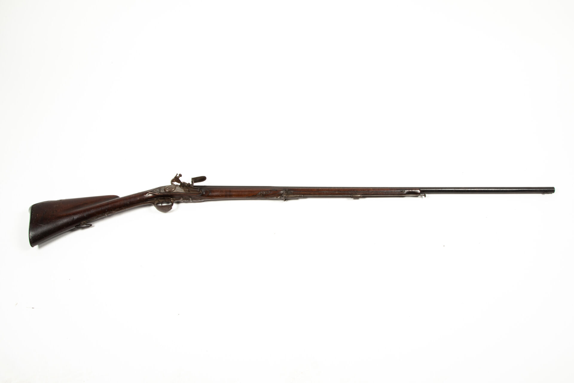 Élégant petit fusil de chasse mono-coup à silex au calibre de 24 balles à la livre, canon octogonal puis rond à platebande de 1040 mm de long, carré de baïonnette, platine à corps plat, chien col de cygne à corps plat, bassinet fer, pontet à volutes, arme montée fer, plaque de couche à retour festonné, belle monture en pied de vache en noyer avec incrustation de fils d’argent, logement de platine se prolongeant par une larme, sculpture au niveau de la queue de culasse, baguette fer , monture dont la tuile se prolonge à mi canon, mécanisme fonctionnel, fine baguette fer postérieure.