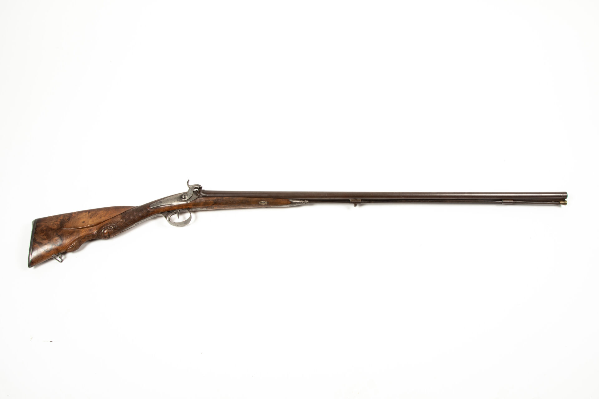 Joli fusil à percussion et platines à l’arrière monté avec des canons en table en damas filé couleur chocolat, calibre de 20 balles à la livre de 910 mm de long, chien zoomorphe, arme montée fer, plaque de couche à secret, la trappe découvrant un logement vide. Belle monture en loupe de noyer, quadrille florale au devant et à la poignée, sculpture du col de crosse en tête d’homme sauvage à la barbe fleurie, double joue, la joue à gauche plus prononcée se terminant en volutes florales sculptées, avec sa baguette en fanon de baleine. Un canal de baguette ressoudé grossièrement, réparation au fût. Mécanisme fonctionnel.