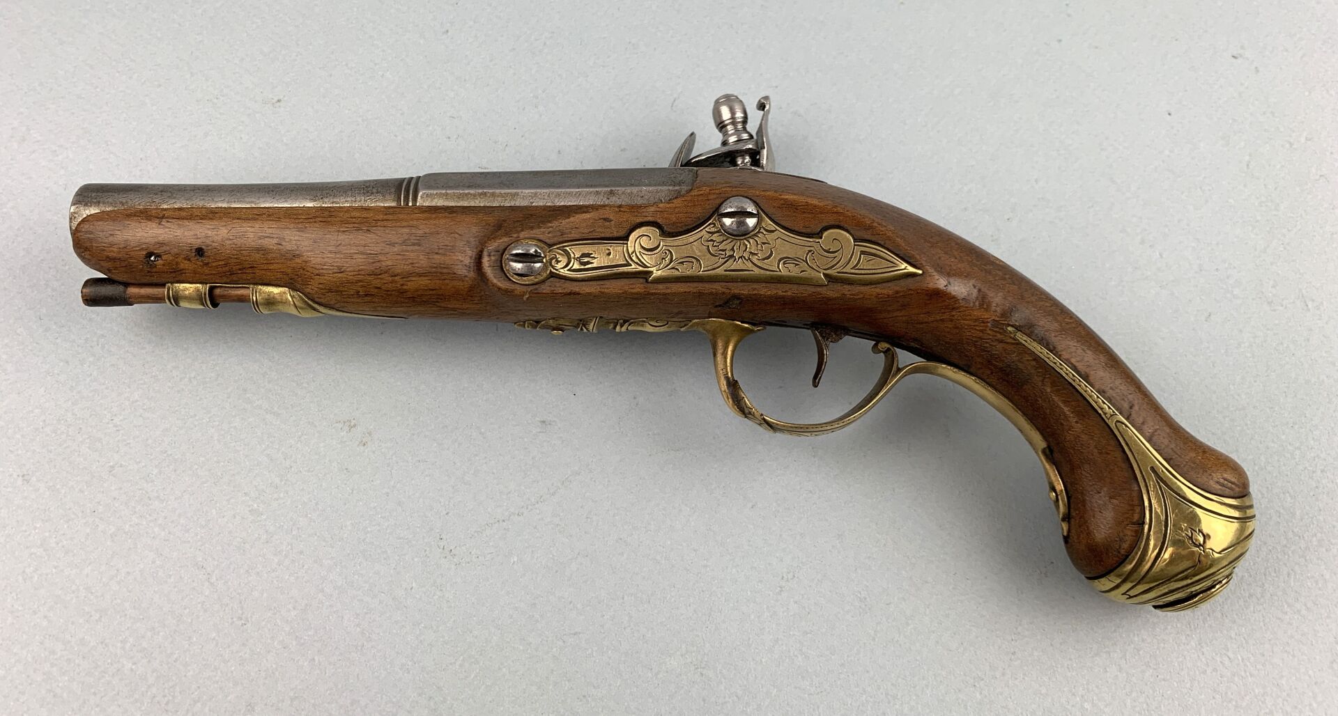 Pistolet de voyage à silex, canon octogonal puis rond en calibre 30 à la livre, arme montée laiton, calotte à longues oreilles corps de platine plat, chien col de cygne rond (?), bassinet fer à pans, baguette postérieure, monture noyer, mécanisme fonctionnel.