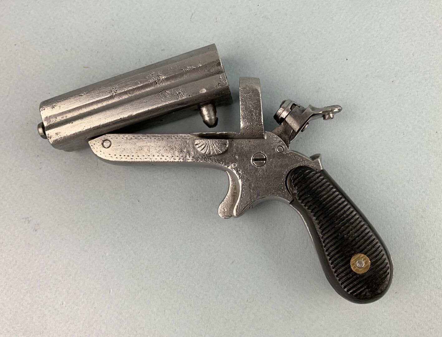 Pistolet de défense basculant à quatre canons, calibre 32, signé sur les canons « LOS HERMANOS VIZCAINOS – OVIEDO », percuteur rotatif à quatre positions, poussoir d’ouverture à gauche, carcasse acier, plaquettes postérieures, mécanisme fonctionnel