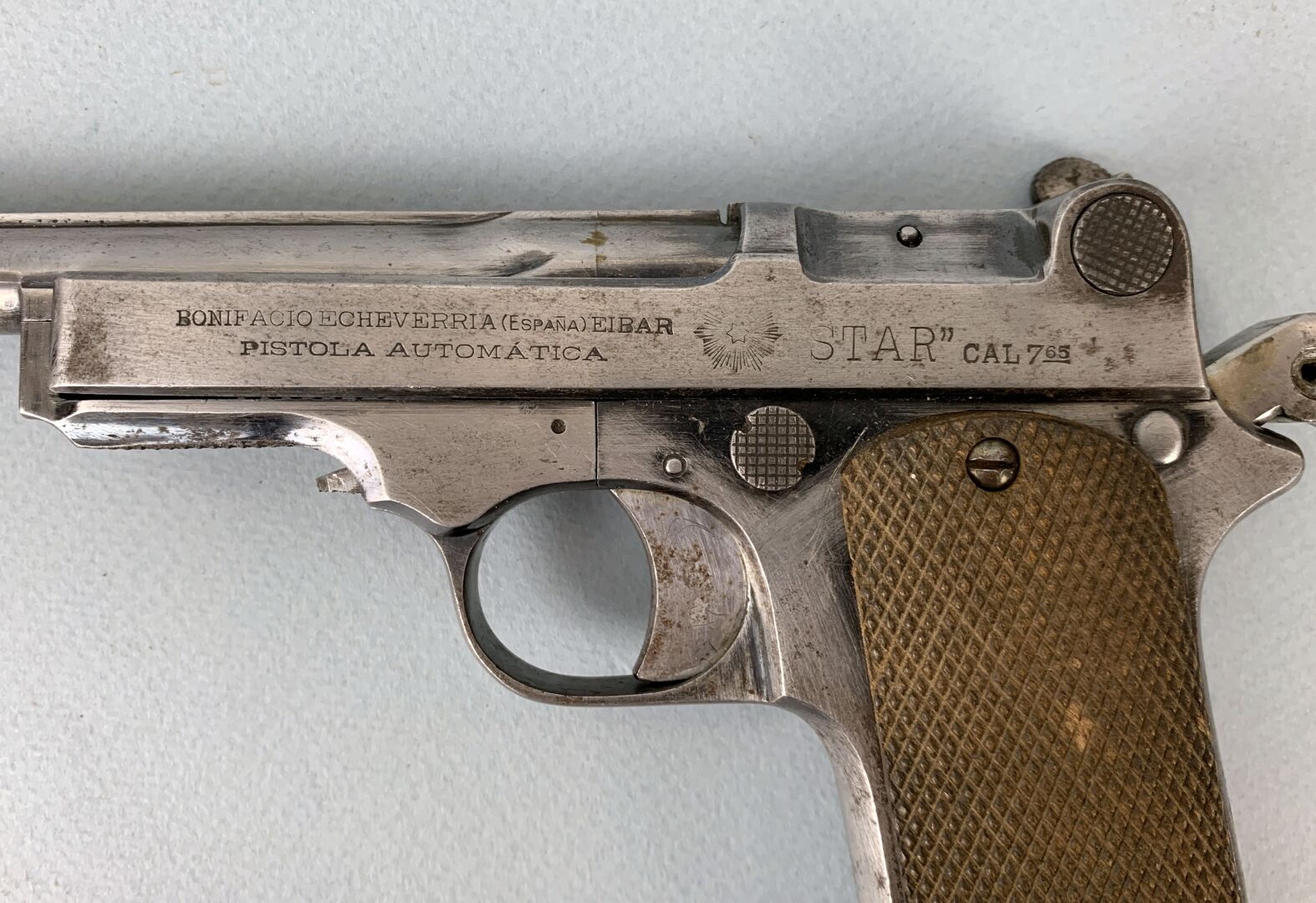 Pistolet semi automatique STAR (Bonifacio Echeveria Eibar) type 14, calibre 7.65. Pistolet règlementaire dans l’armée française pour l’armement des officiers durant la Première Guerre Mondiale. Arme en très bel état sauf bronzage absent, plaquettes en noyer quadrillé.