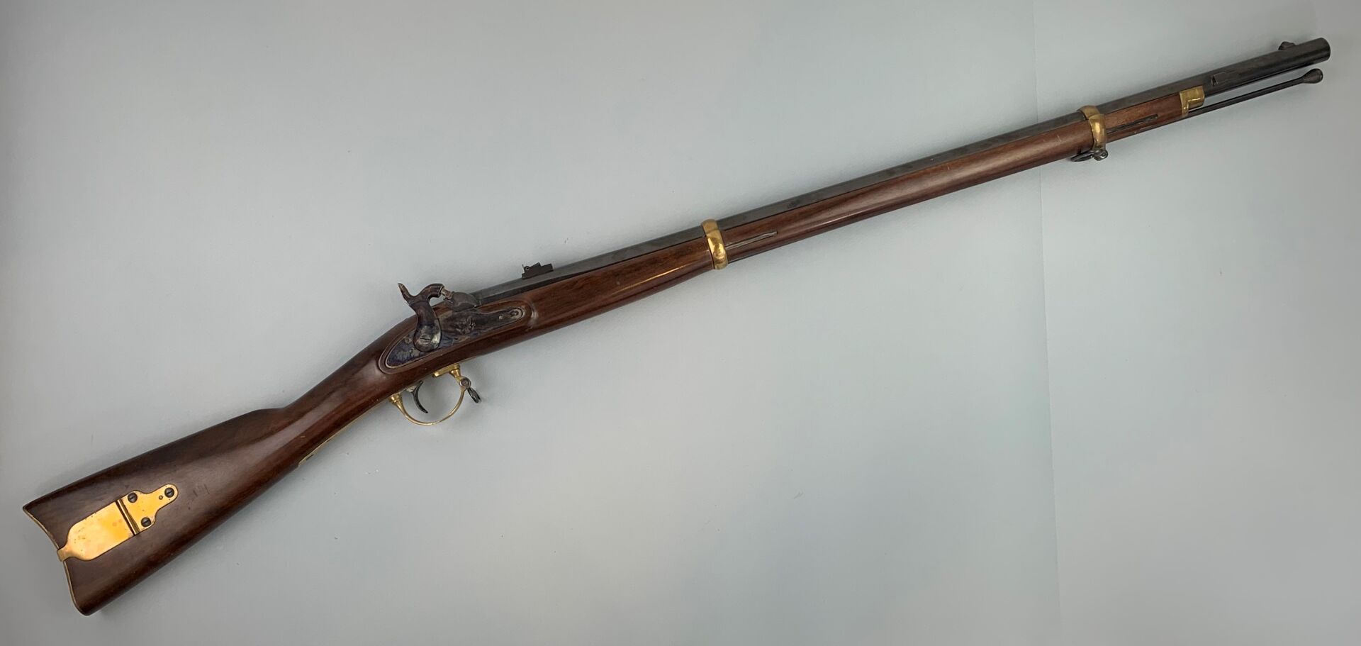 Réplique Italienne par Army Sport d’un fusil à percussion US Springfield 1863, calibre 58 à balles Minié, canon rayé deux bandes, arme montée laiton, patch box dans la crosse, crosse en noyer vernis