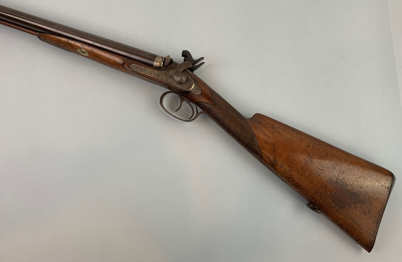 Joli fusil juxtaposé à percussion en calibre 14 à la livre, canon bronzé noir d’origine de 755 mm de long, platine à l’avant, gravure florale( volutes) sur les corps de platine et sur les chiens, belle crosse Anglaise quadrillée en noyer vernis exempte de coups et de fentes, plaque de couche en tôle, baguette bois postérieure, mécanisme fonctionnel