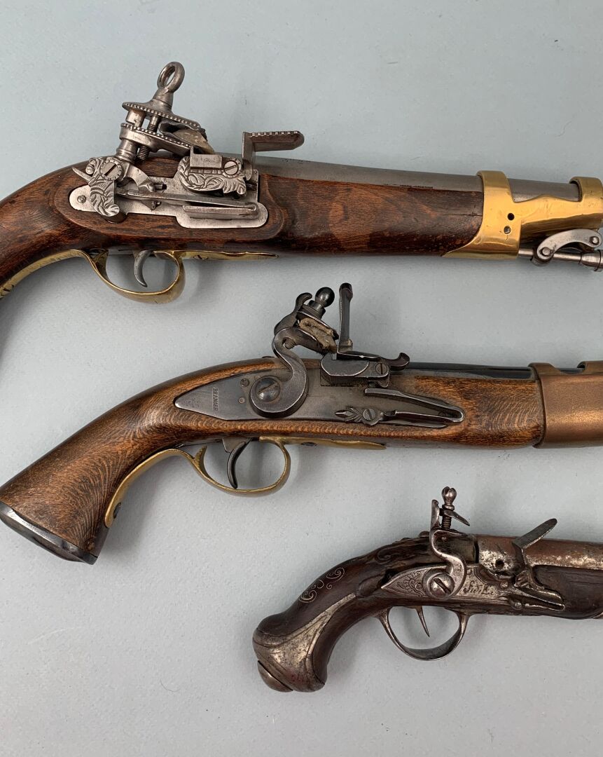 Ensemble de trois armes à silex dont un petit pistolet de gousset monté fer à restaurer, une réplique de pistolet de Garde du Corps du Roi Espagnol et une réplique décorative de pistolet à silex