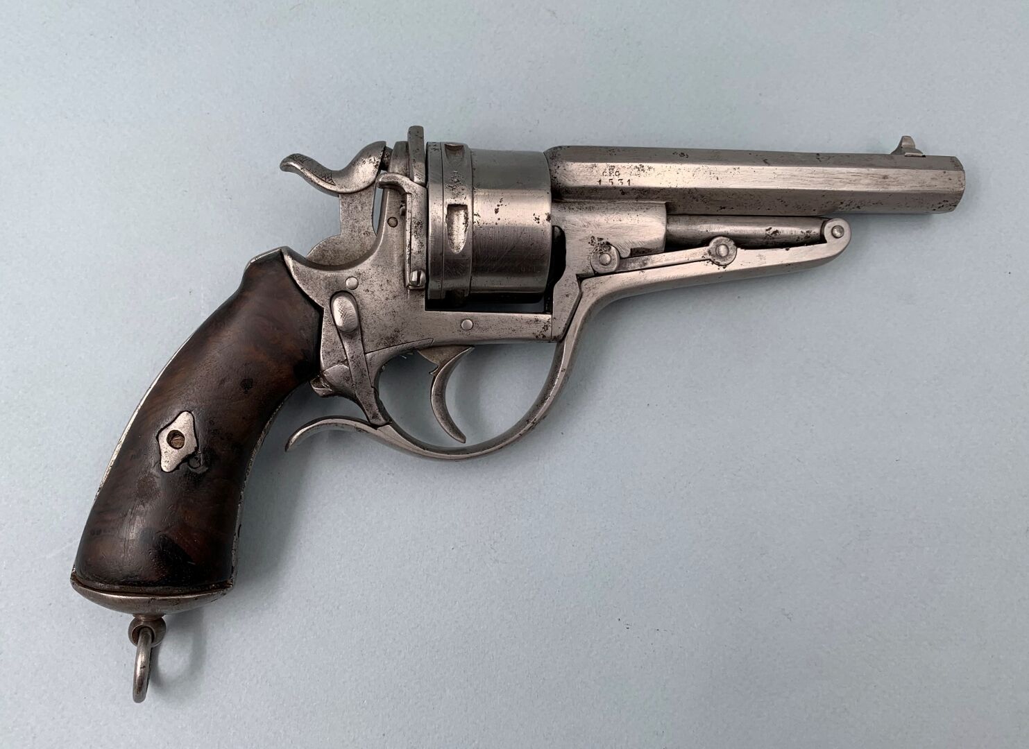 Grand révolver à système Galand, calibre 12 mm Galand, version à canon octogonal, arme restaurée et repolie, intéressante variante dotée d’un système de blocage du levier d’ouverture, une portière de chargement inhabituelle se trouve sur le flanc droit de la carcasse, mécanisme fonctionnel, très bon canon pour le tir