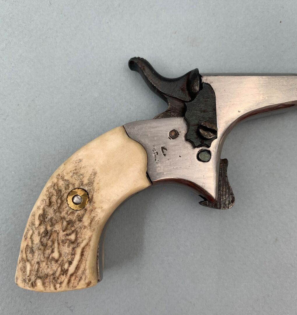 192 RÉSULTAT: 150 € ESTIMATION: 100 / 120 € Pistolet cycliste mono coup à coffre et percussion annulaire, canon octogonal puis rond, détente mexicaine, plaquettes en bois de cerf, mécanisme fonctionnel Arme de catégorie D Etat 1