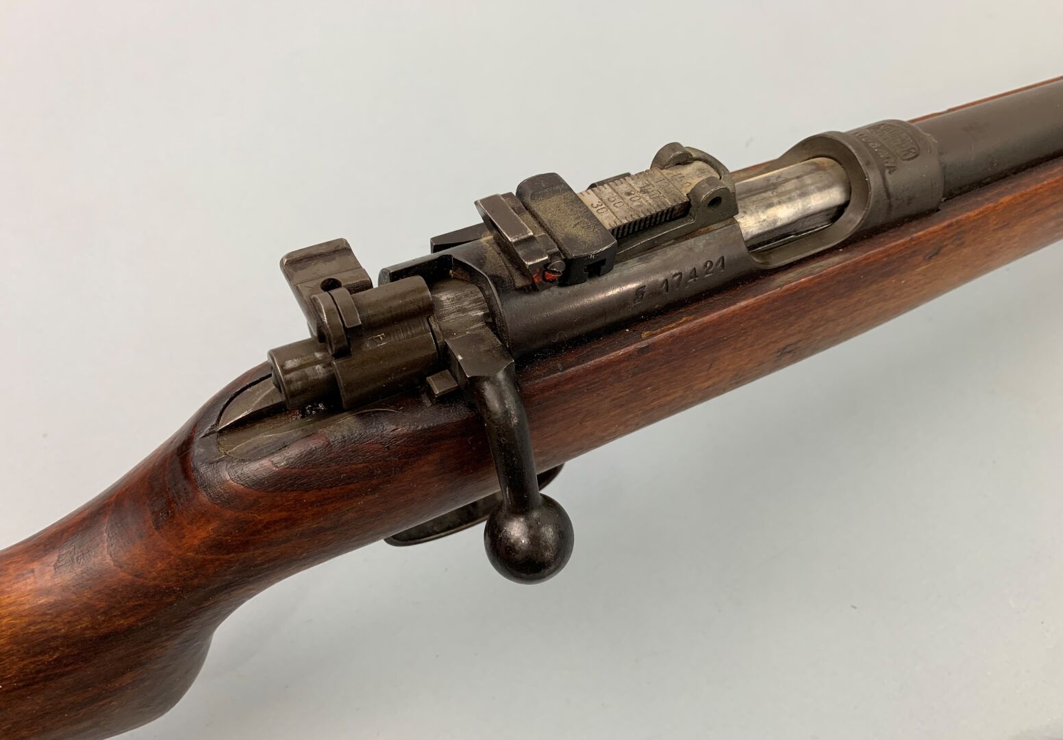 Carabine 22LR MAUSER modèle 45 A, crosse en hêtre, longueur de canon 610 mm, chargeur 5 coups du modèle, ressort de hausse défectueux, avec sa brettelle, mécanisme fonctionnel