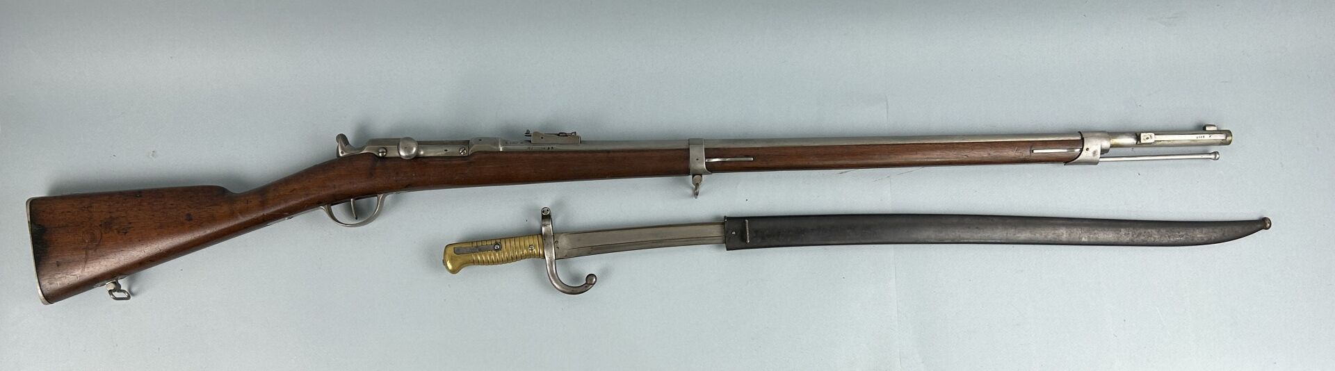 Joli fusil d’Infanterie chassepot modèle 1866 issu de la Manufacture Impériale de Saint Etienne en 1867, arme monomatricule poli blanc d’origine, face arrière du levier d’armement striée, vis de queue de culasse changée, joint en caoutchouc présent mais sec, très bon canon pour le tir (miroir), mécanisme fonctionnel, avec une baïonnette yatagan tardive (Aout 74)