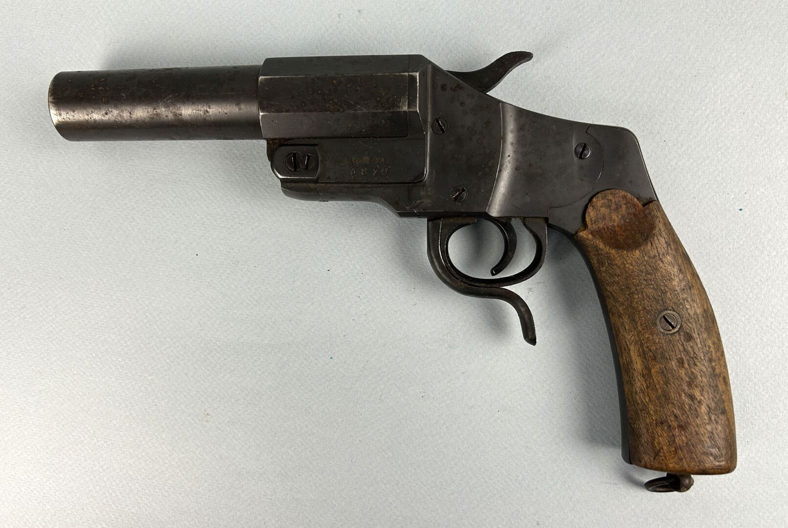 Rare variante du pistolet Lance fusée Hebel 1894 à canon court, calibre 4. Arme numéro 3820. Canon court de 155 mm en lieu et place du canon habituel de 227 mm. Marquage « H. 24 ». Mécanisme fonctionnel.