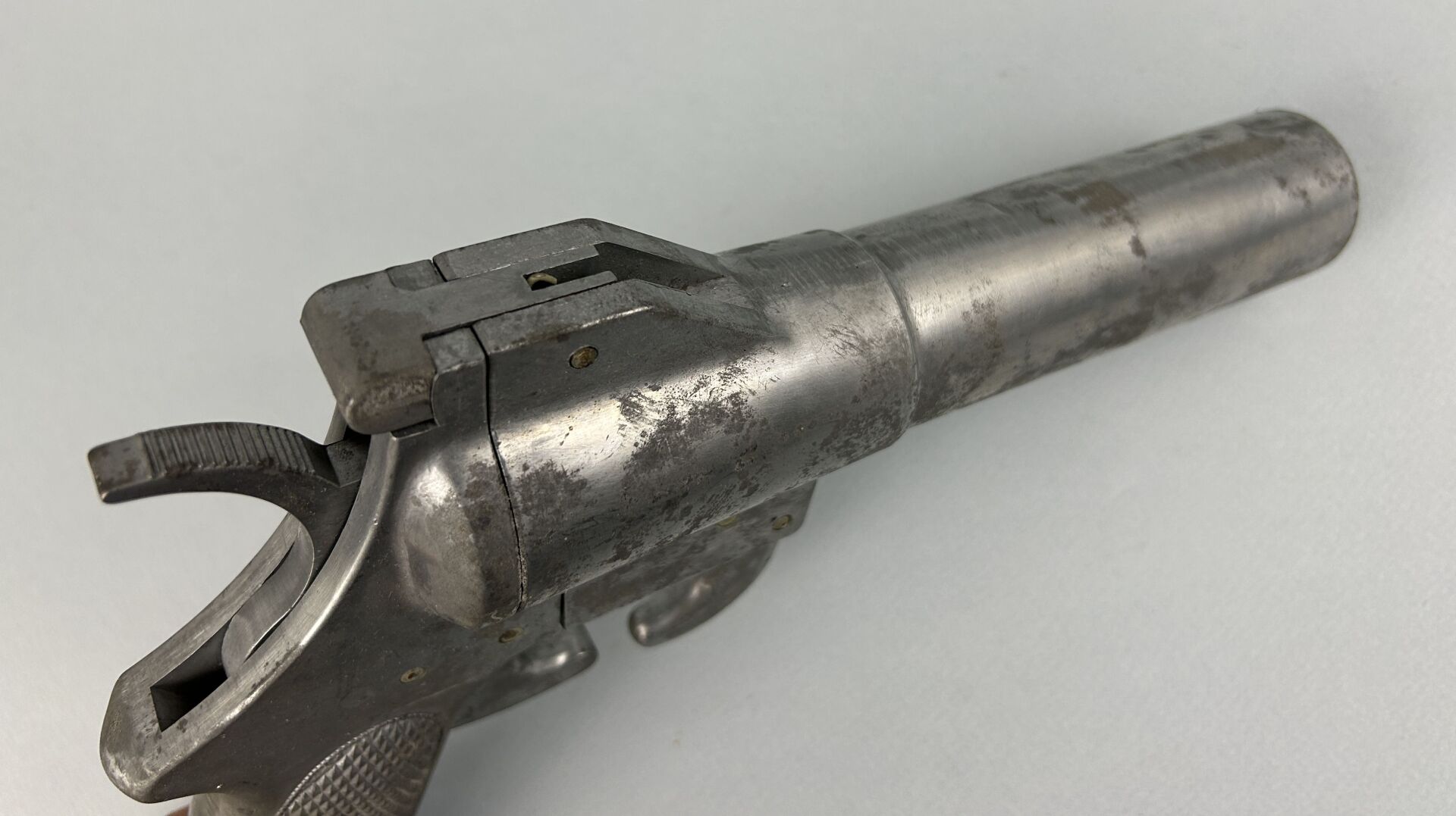 Pistolet Lance fusée U.S type 1953 calibre 40 mm. Arme marquée « U.S.C.G. APPROV N° 160.028/6/1 Signal Pyrotechnic C° Los Angeles 11062 PT. 1.53. ». Carcasse et poignée dans la masse en zinc monobloc poignée quadrillée dans la masse, avec sa dragonne. Mécanisme fonctionnel.