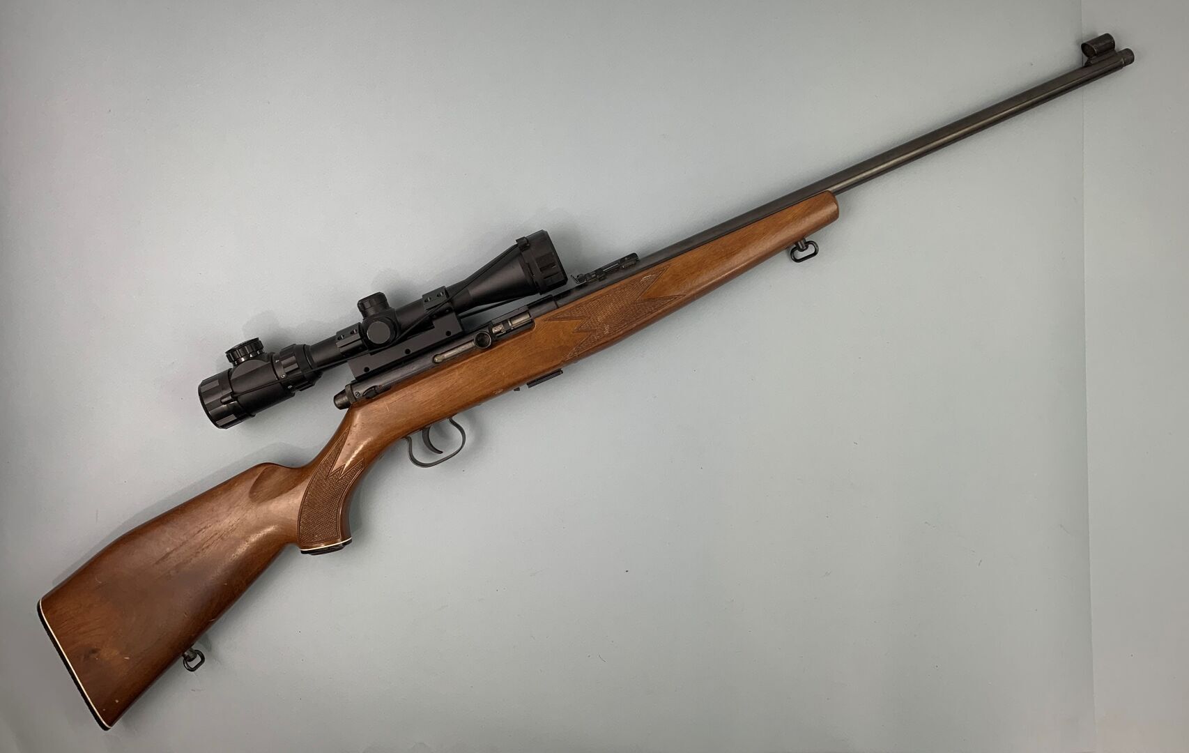 264 RÉSULTAT: 90 € ESTIMATION: 150 / 200 € Carabine semi-automatique KRIKO, calibre 22 LR avec une lunette Jeff & Jenny (3-9 x 40 EG), réticule lumineux, mécanisme fonctionnel Arme n° : 286421 Arme de catégorie B Etat 1 N° RGA : AH373