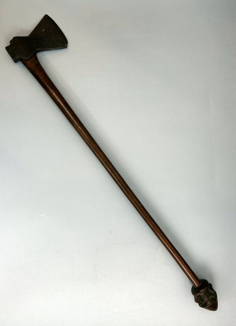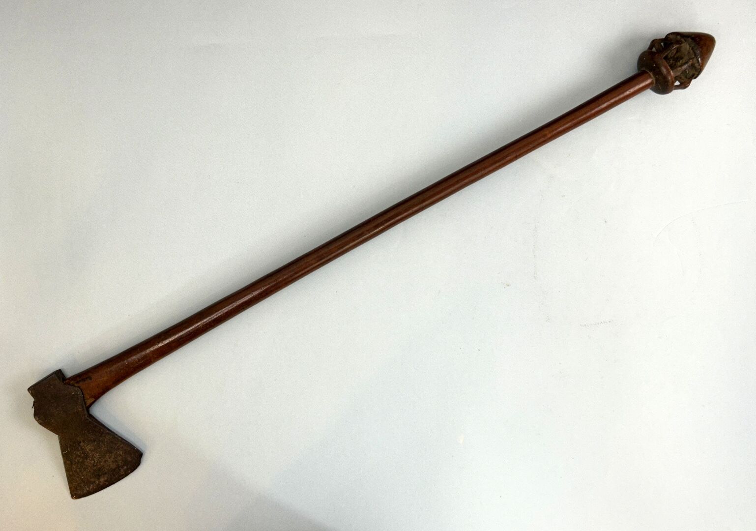 Intéressante hache, probablement votive du Vanuatu, fer de traite signé « FG CARGO », dos formant marteau monté par les naturels avec un manche en bois dur de 880 mm de long parfaitement ajusté au fer (manque au bois) à terminaison gravée d’un motif ajouré « à la lanterne » à terminaison en cône, monture au bois parfaitement polie, objet extrêmement décoratif et évocateur des premiers contacts avec la civilisation occidentale
