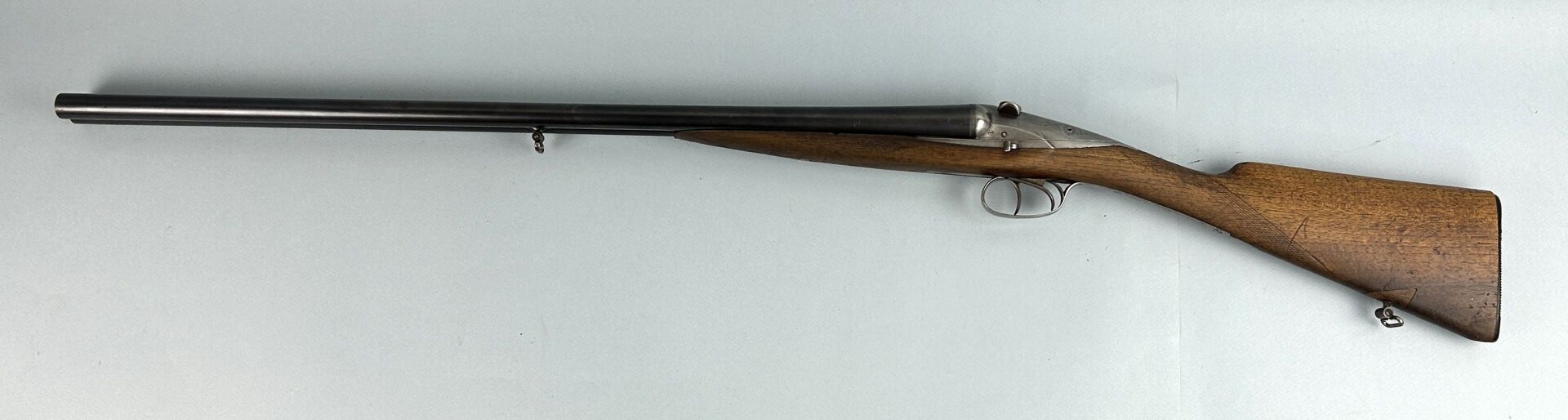 Fusil de chasse calibre 16 de type Darne, à 2 canons en table de 695 mm, crosse anglaise en noyer de 350 mm en partie quadrillée et plaque de couche ébonite noire, mécanisme fonctionnel