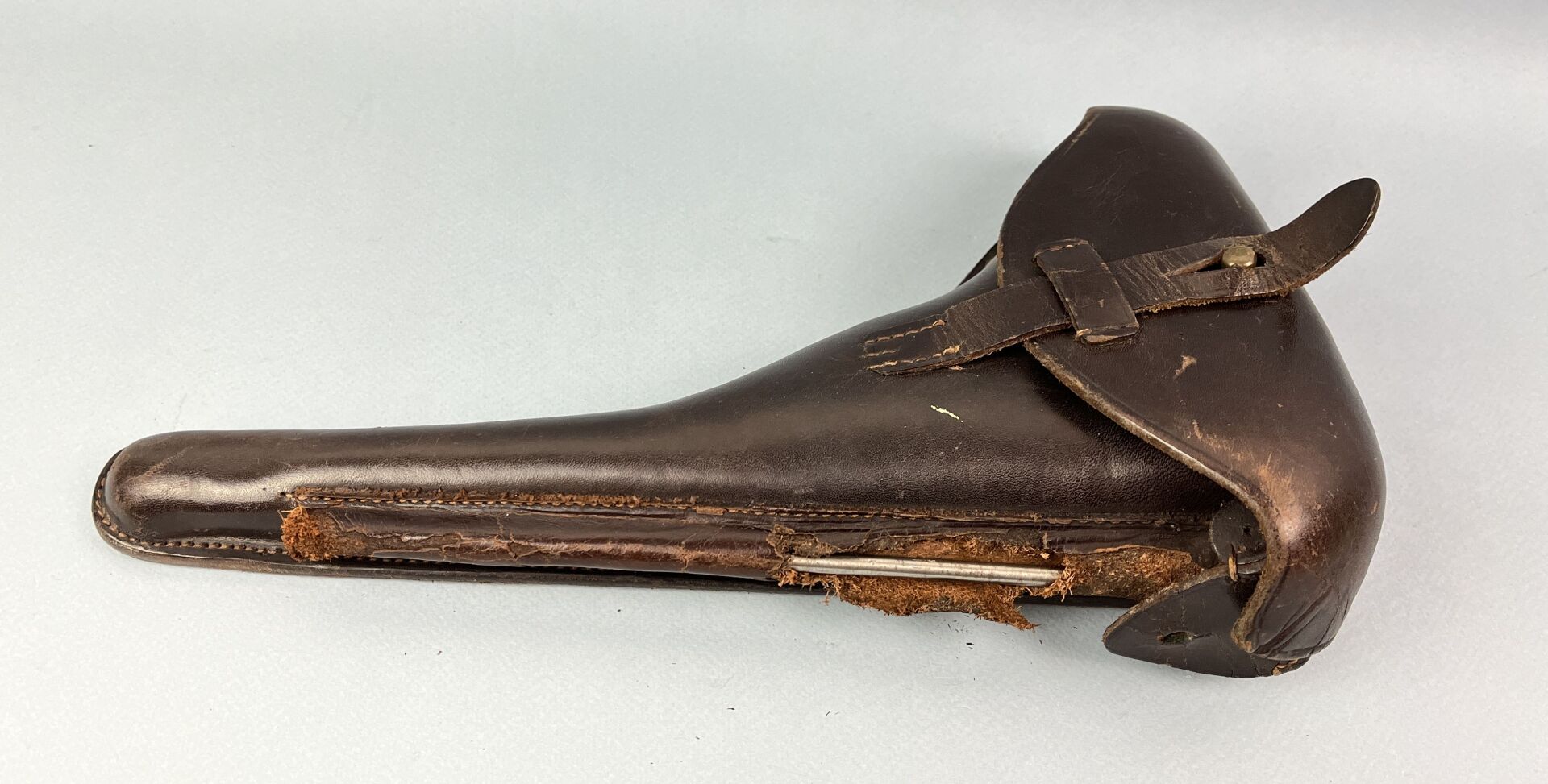 Pistolet P08 modèle artillerie, fabrication DWM 1917 fin d’année (pas de vis sur la hausse ni sur le flanc du guidon), arme rebronzée, portière moderne sans numéro, détente numéro différent, levier de démontage de la portière plein et non numéroté, très bon canon pour le tir, rayures franches, pas de piqures, chargeur fond bois sans numéro. Dans son étui en cuir fauve d’origine avec sa baguette de nettoyage, son outil de chargement, réception BA IV dans le rabat, arrière de l’étui modifié pour passant de ceinturon, logement de baguette déchiré, verrou de pochette à chargette arraché ainsi que la languette de sortie du pistolet.