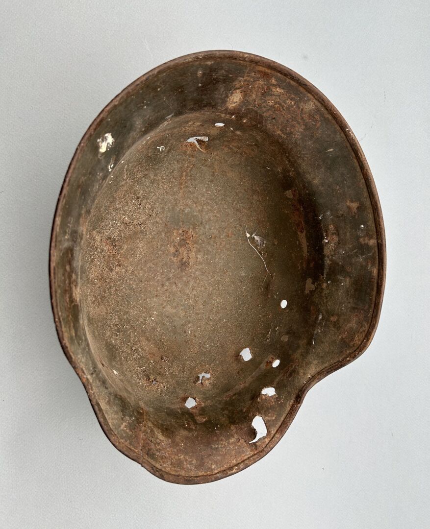 Coque de casque allemand modèle 35 avec de nombreux impacts et éclats d’obus ayant traversé de part en part, peinture d’origine 20 % , insigne national visible à 5%