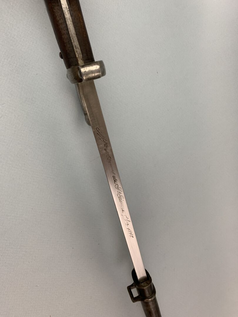 47 RÉSULTAT: 65 € ESTIMATION: 50 / 60 € Baïonnette de fusil Gras infanterie modèle 1874, fabrication Saint Etienne 1876, fourreau tôle d’acier pas au numéro Etat 1