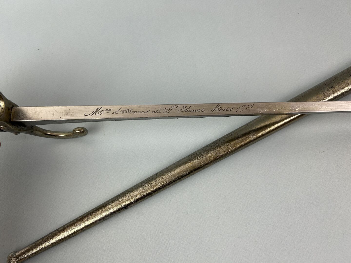 50 RÉSULTAT: 70 € ESTIMATION: 50 / 60 € Baïonnette de fusil Gras infanterie modèle 1874, fabrication Saint Etienne 1879 dans son fourreau au numéro, bronzage absent, belle lame, peau d’orange sur le fourreau Etat 1-