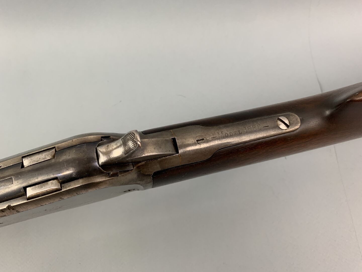 Intéressant rifle Winchester modèle 1886 (fabrication 1893) en calibre 38-56 WCF. Canon lourd octogonal de 680 mm de long. Devant bois terminé par une capuche fer. Très bon canon pour le tir, belles rayures franches et nettes. Boite de culasse avec reste de jaspage, canon et tube magasin ayant viré au tabac. Mécanisme fonctionnel.