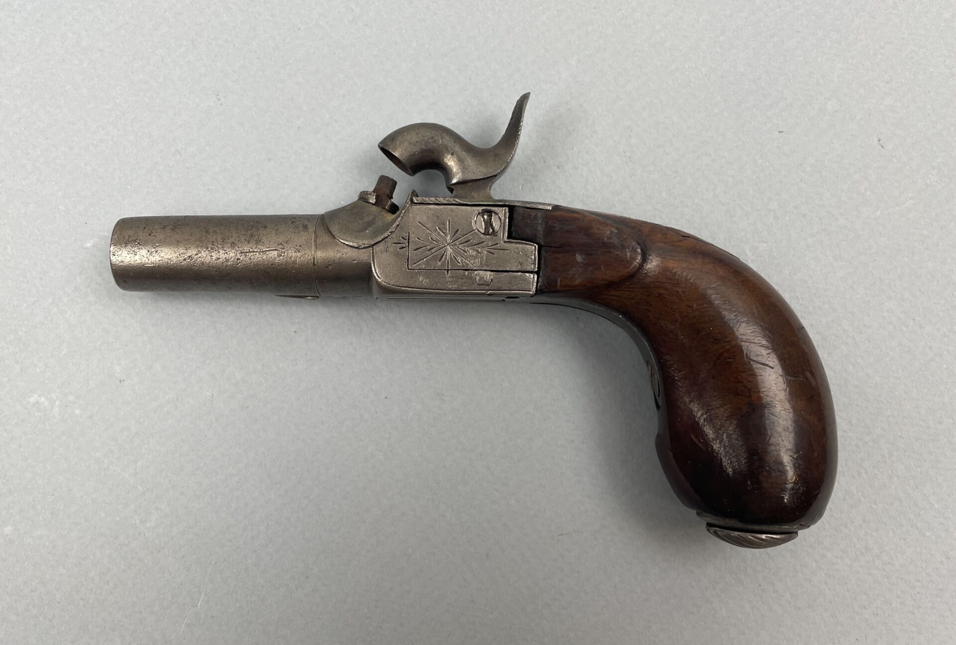 Pistolet monocoup à coffre et à percussion à balles forcées, canon rond démontable au calibre de 48 balles à la livre, détente repliable, crosse ronde avec réserve d’amorce dans la calotte, couvercle acier en forme de coquille Saint Jacques. Mécanisme fonctionnel.