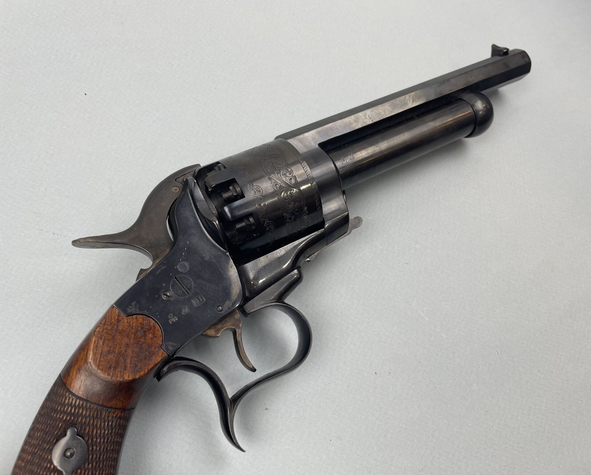 Réplique moderne d’un révolver Le Mat à percussion, fabrication italienne (Fillipietta). Barillet à neuf coups à percussion et canon central en calibre 20. Mécanisme fonctionnel.