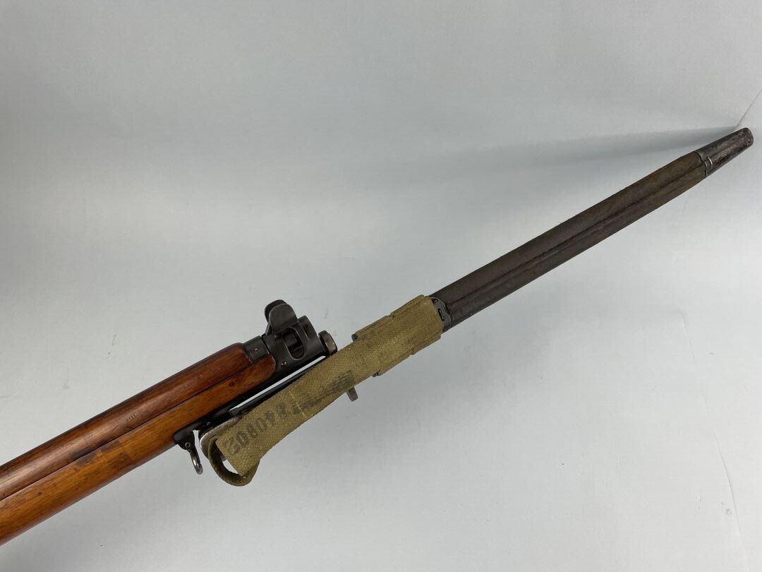 Fusil règlementaire anglais LEE ENFIELD NR 1 MK 3, première Guerre Mondial, calibre 303 Sporting, fabrication B.S.A et Compagnie, version avec son cut off, avec sa bretelle et une baïonnette dans son fourreau cuir et acier sur un porte fourreau en toile postérieur. Mécanisme fonctionnel.