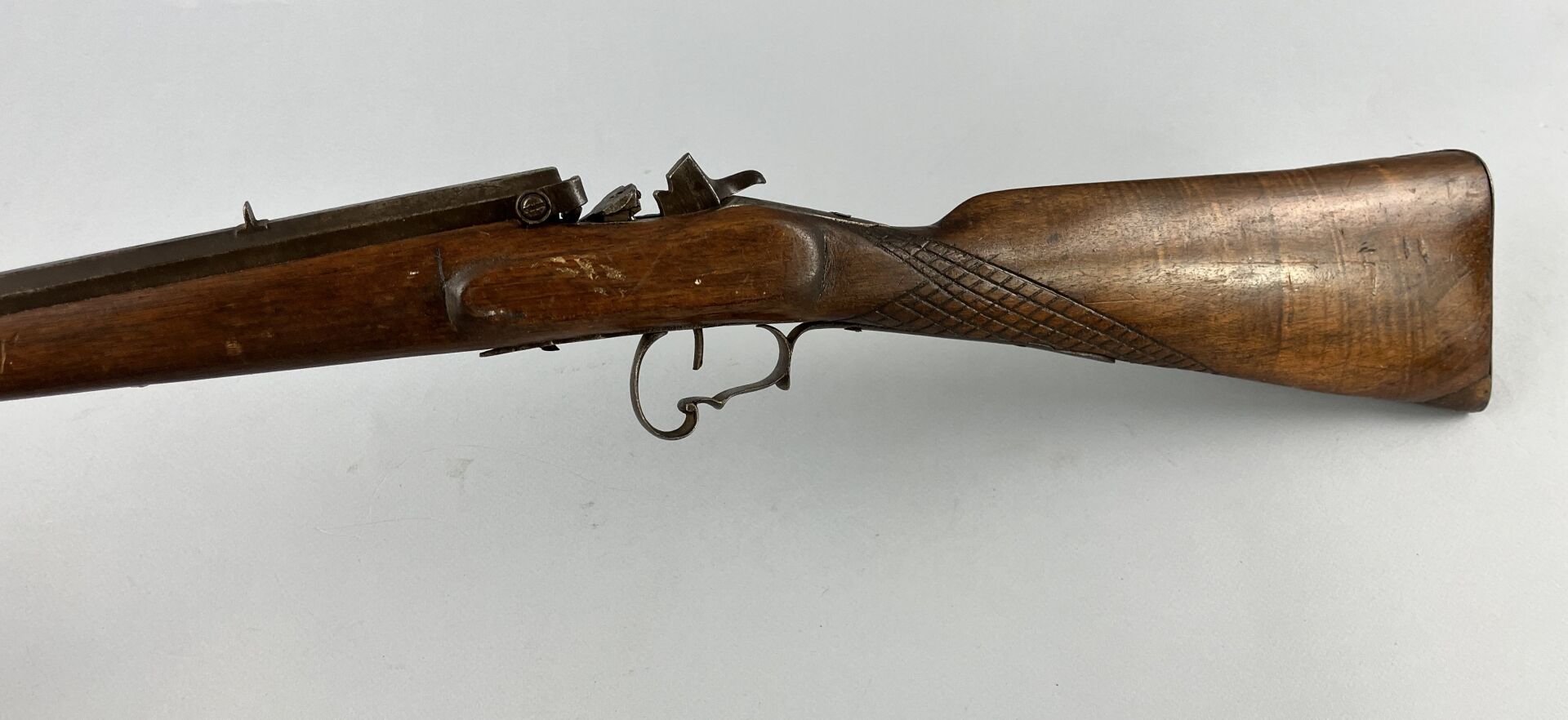 72 RÉSULTAT: 10 € ESTIMATION: 10 / 20 € Épave de carabine Flobert calibre 9 mm, canon à revoir, maitre ressort absent, mécanisme à revoir pontet à volute, crosse refaite artisanalement. Arme de catégorie D Etat 3-
