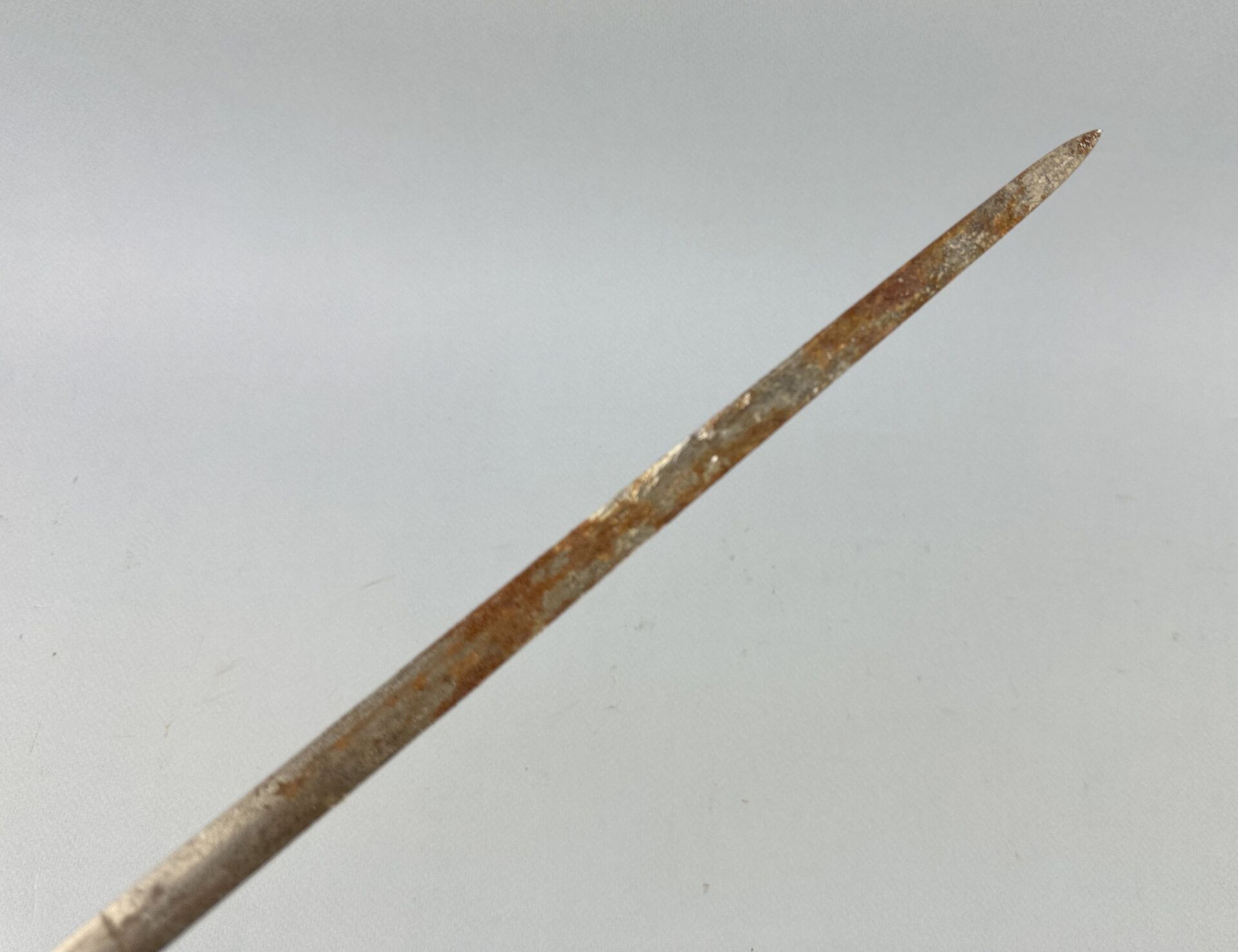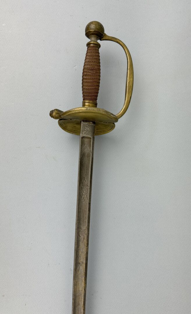 Epée d’Officier début XIX eme , lame droite, dos plat et gorge au demi, le faible de la lame étant de section lenticulaire, monture en bronze, pommeau rond, branche de garde unique, pontât dissymétrique et contrarié, le pontât principal arqué vers la lame, fusée filigranée d’un double filigranée alternant chevrons et filigranée plus fin, Pas de fourreau