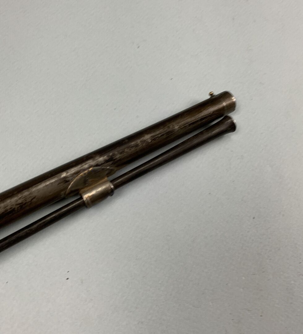 Grand pistolet à percussion, platine à l’arrière, arme montée fer, très long canon octogonal à la base puis rond en calibre 42 à la livre, canal de baguette rapporté postérieurement vers la bouche, baguette fer, crochet de ceinture, mécanisme fonctionnel