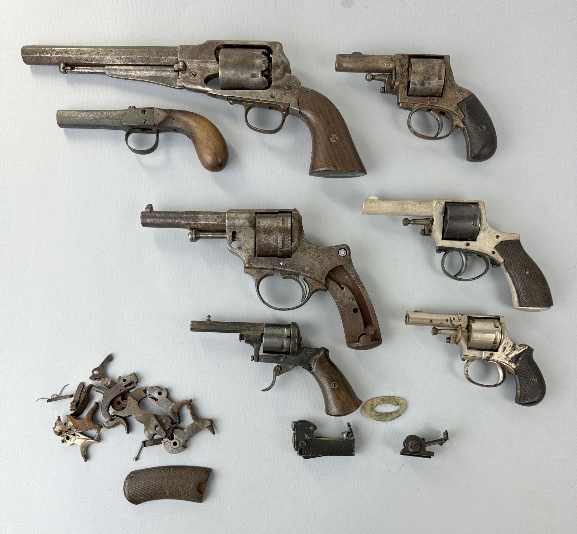 Intéressant lot pour collectionneur débutant ou revendeur de 7 armes de poing démontées plus ou moins complètes, on y trouve un révolver 1876, un révolver Rémington 1858 New Model d’origine, quelques révolvers à broche ou à percussion centrale Belge ainsi qu’un coup de poing à percussion. Ces armes ont été démointées par leur ancien propriétaire pour des raisons de sureté, les chiens et quelques pièces sont livrés à part, leur remontage ne devrait pas poser de problème à un restaurateur habile, même débutant.