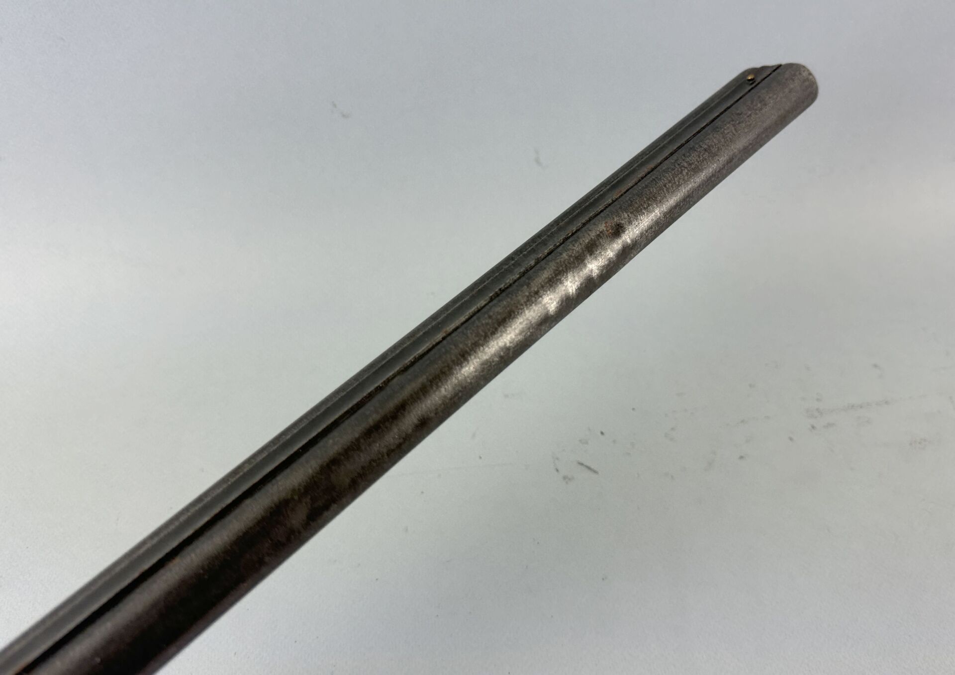 Fusil juxtaposé à broche, calibre 16/, monture fer, canons damas, mécanisme fonctionnel. Ouverture par clef type Lefaucheux. Crosse anglaise, bouches et intérieurs des canons sains. Aucun jeu, impact sur le canon droit de l’arme.