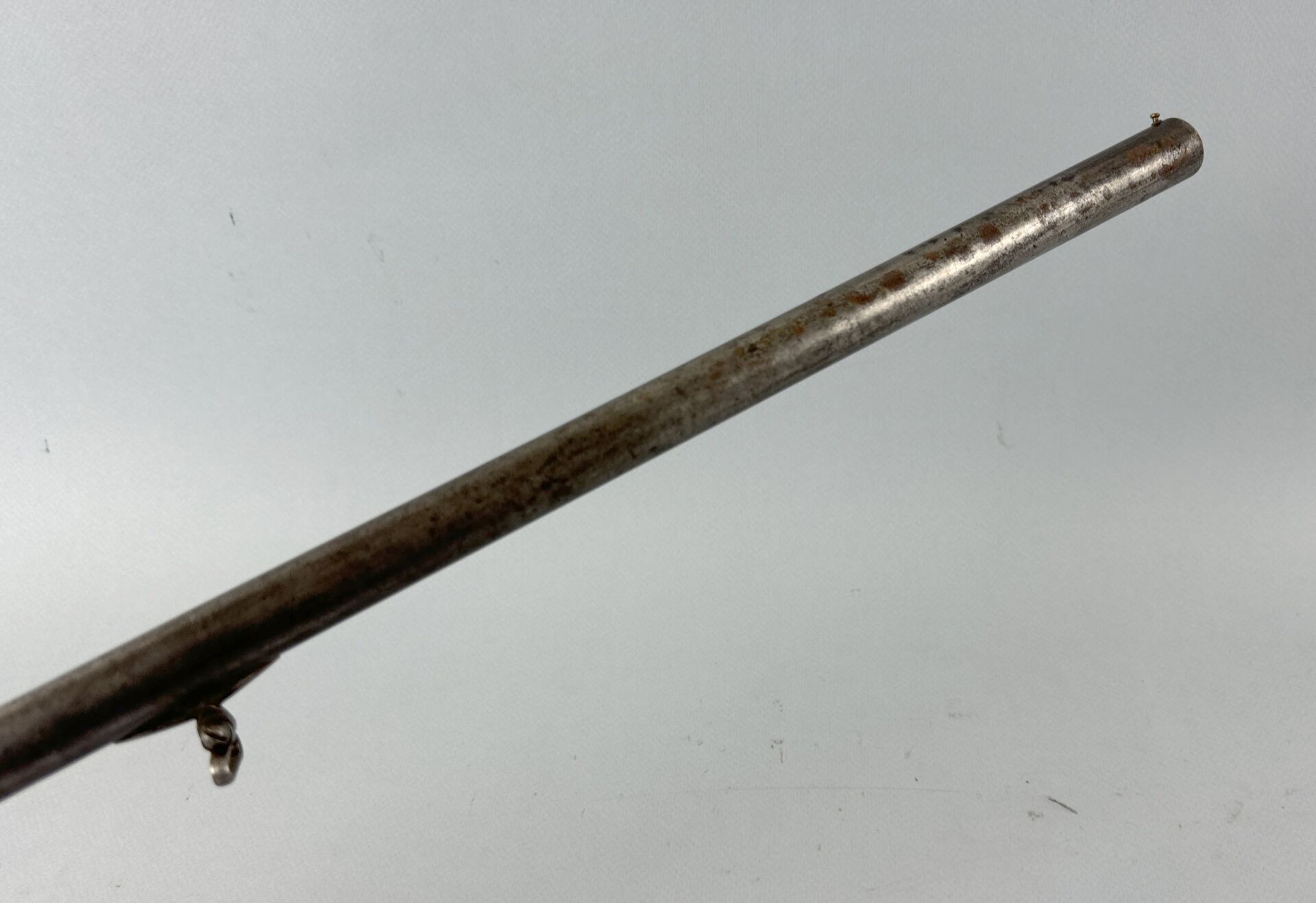 Fusil monocoup basculant en calibre 16/65, canon de 700 mm de long, platine à l’arrière et chien, ouverture par basculement du pontet vers le bas type simplex, ressort de verrouillage à revoir, crosse demi-pistolet, toutes parties métalliques entièrement blanches, mécanisme fonctionnel.