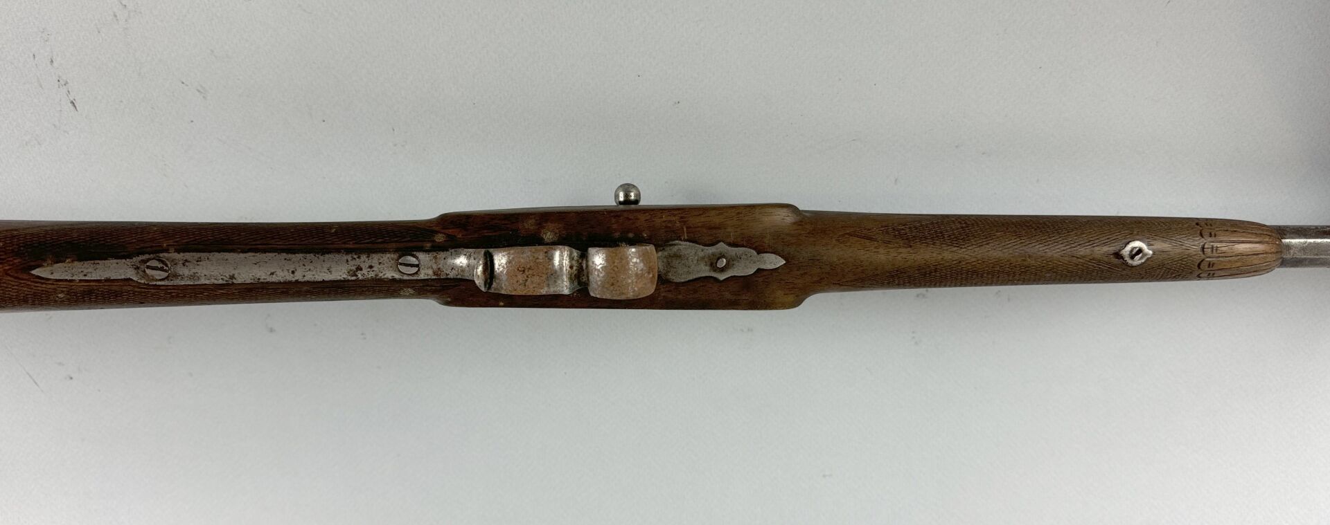 Carabine de jardin système Flobert, calibre 9 mm flobert, culasse basculante, mécanisme fonctionnel. Canon octogonal lisse. à nettoyer. Monture fer, crosse anglaise. Légère oxydation fleur de rouille sur le canon.
