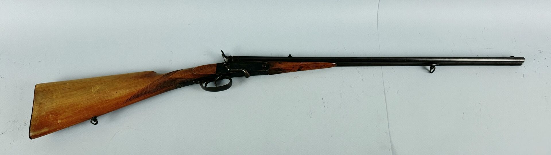 Jolie petite carabine mixte à chiens extérieur, calibre 9 mm Flobert à gauche et 22. à droite. Canons rayés, bascule jaspée, crosse anglaise à repose joue, ouverture par clef sur le coté droit de la bascule. Hausse tir à balles, mécanisme fonctionnel, double détente. Canon droit sain, rayures du canon gauche largement effacées.