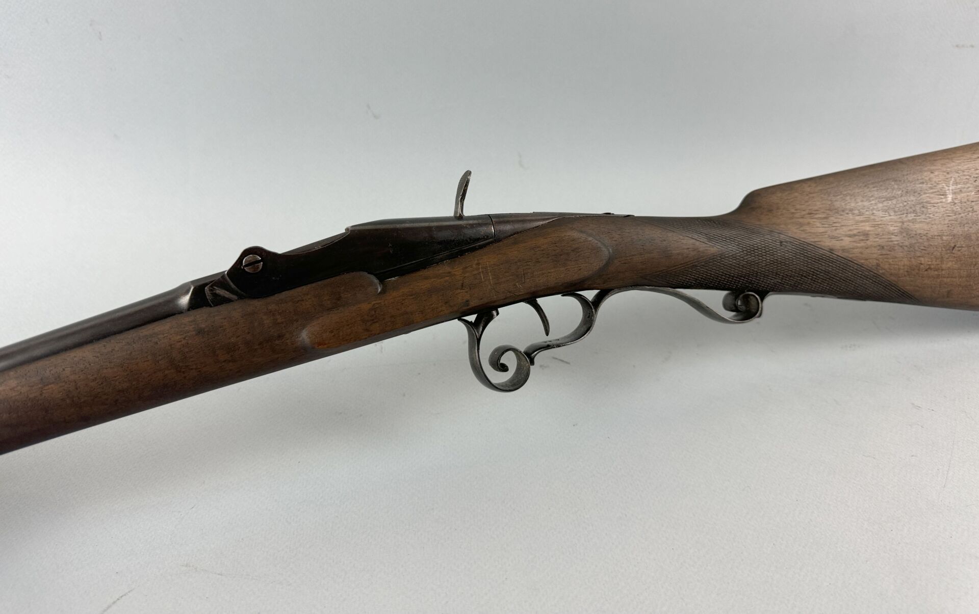 Carabine de jardin système Flobert, calibre 410/50, culasse basculante s’ouvrant à l’aide d’un poussoir sur le coté droit de la culasse, mécanisme fonctionnel. Canon lisse à nettoyer. Crosse anglaise quadrillée, pontet à volutes, arme bronzée noir. Logement prévu dans la crosse pour la fixation d’une grenadière (absente)