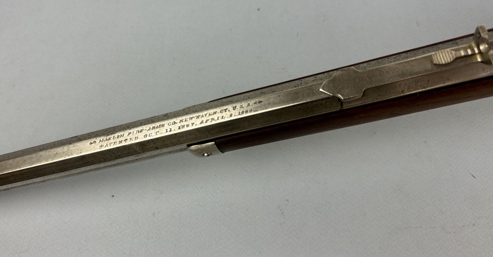 Riffle Marlin à levier de sous garde, calibre 44 WCF, modèle Marlin Safety 1889, arme polie blanc ou nickelée. Canon de 715 mm de long. Monture de forme anglaise, dessin pyrogravé stylisé sur le flanc droit de la crosse. Plaque de couche incurvée. Fût s’arrêtant à mi canon avec capuche. Le magasin de longueur égale au canon. Mécanisme fonctionnel.