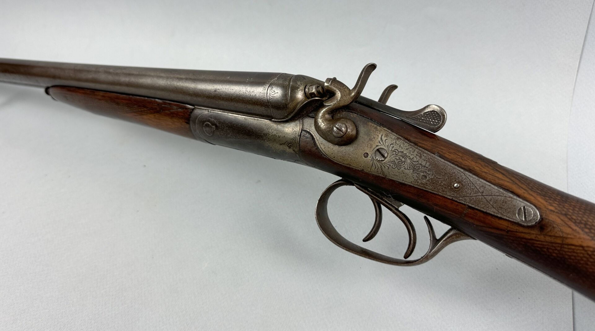 Fusil juxtaposé à chiens et à percussion centrale ouverture par clef entre les chiens, crosse anglaise, rallonge bois, mécanisme fonctionnel, pas d’enclouage.