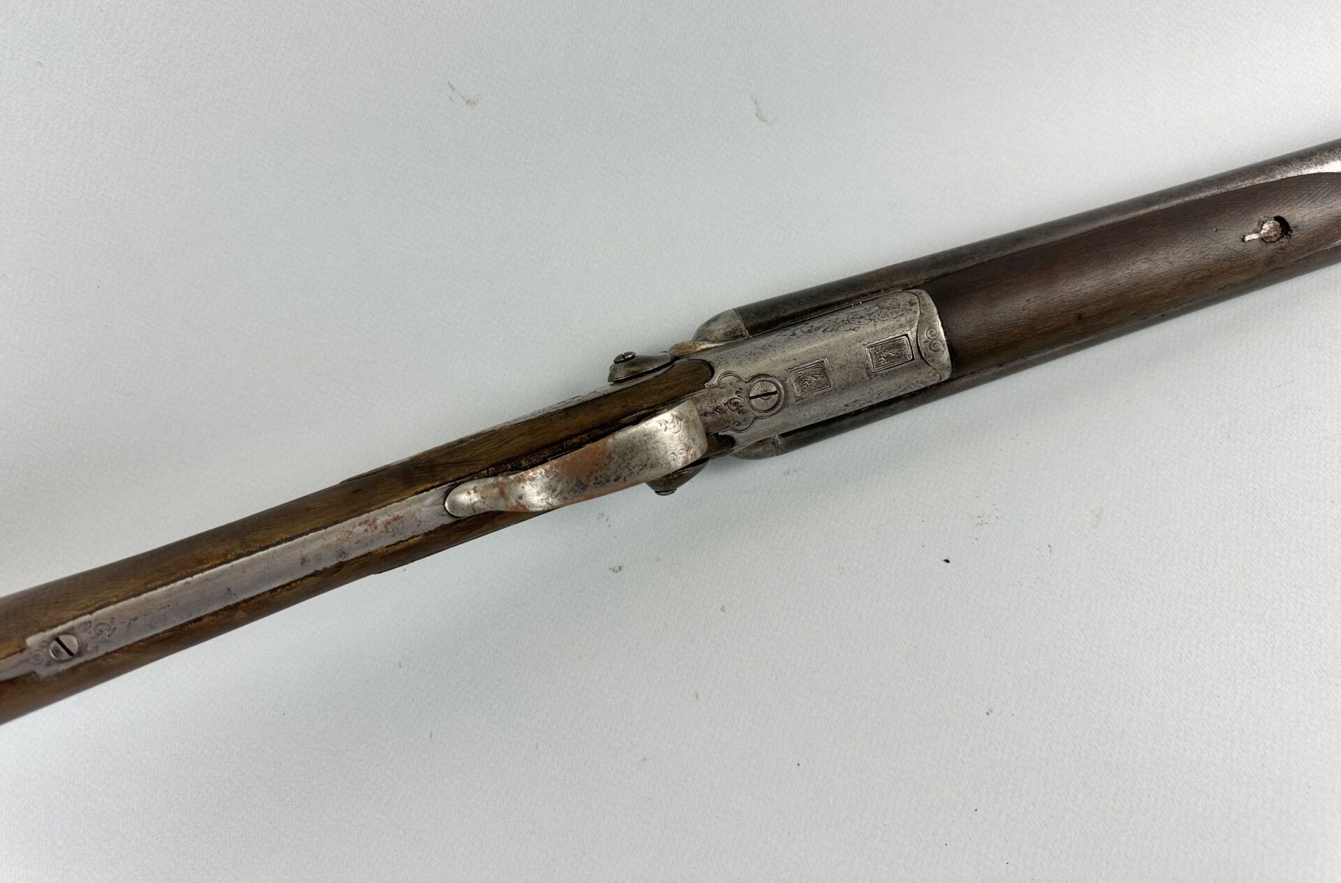 Fusil juxtaposé à chiens et à percussion centrale, calibre 12/65, ouverture par clef entre les chiens, bascule gravée de feuillages, crosse anglaise, mécanisme fonctionnel, pas d’enclouage.