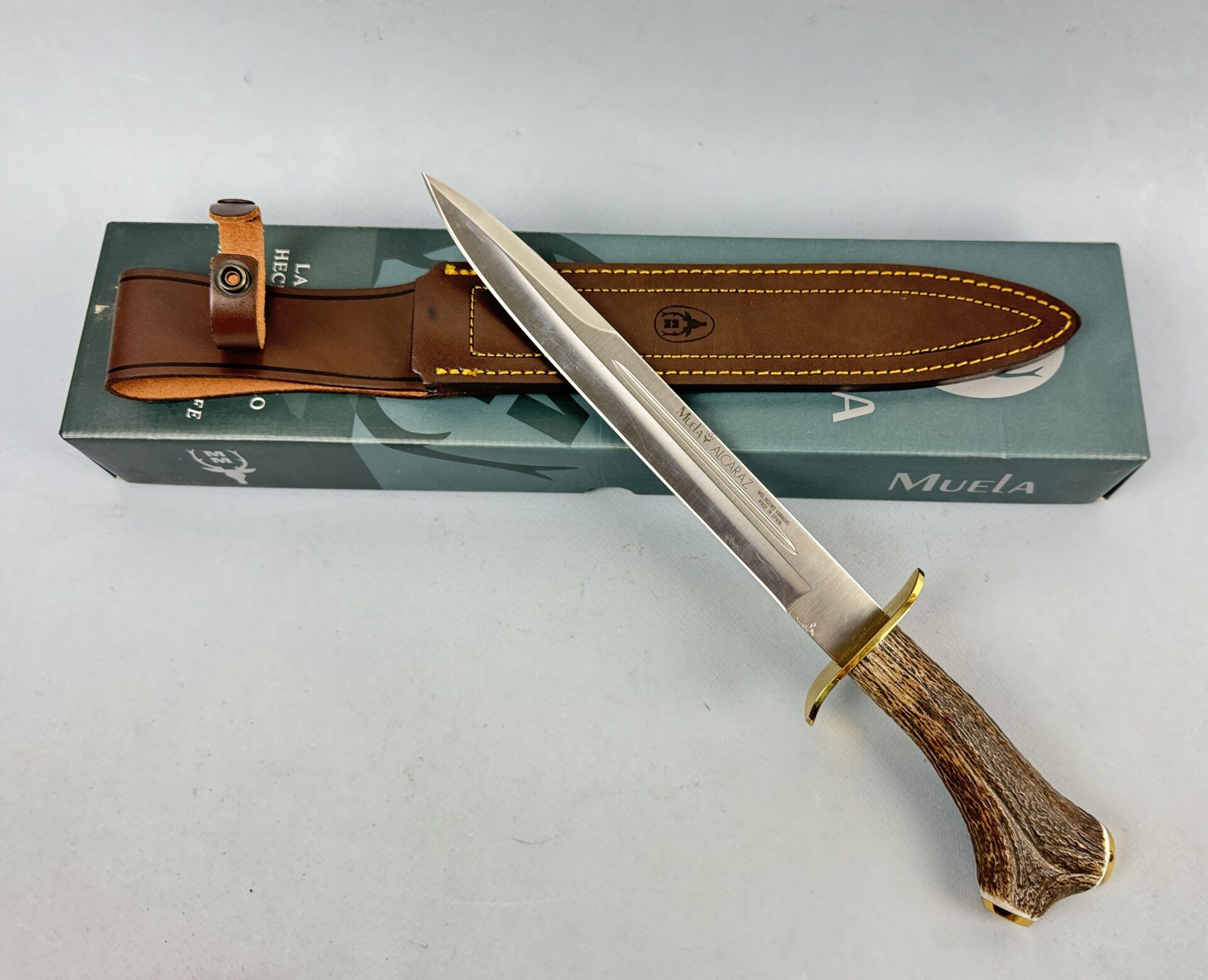Couteau de chasse espagnol Muela, arme neuve dans sa boite, fourreau cuir, lame droite à gorge et à contre-tranchant, garde contrariée en « S », poignée en bois de cerf à deux terminaisons en laiton.